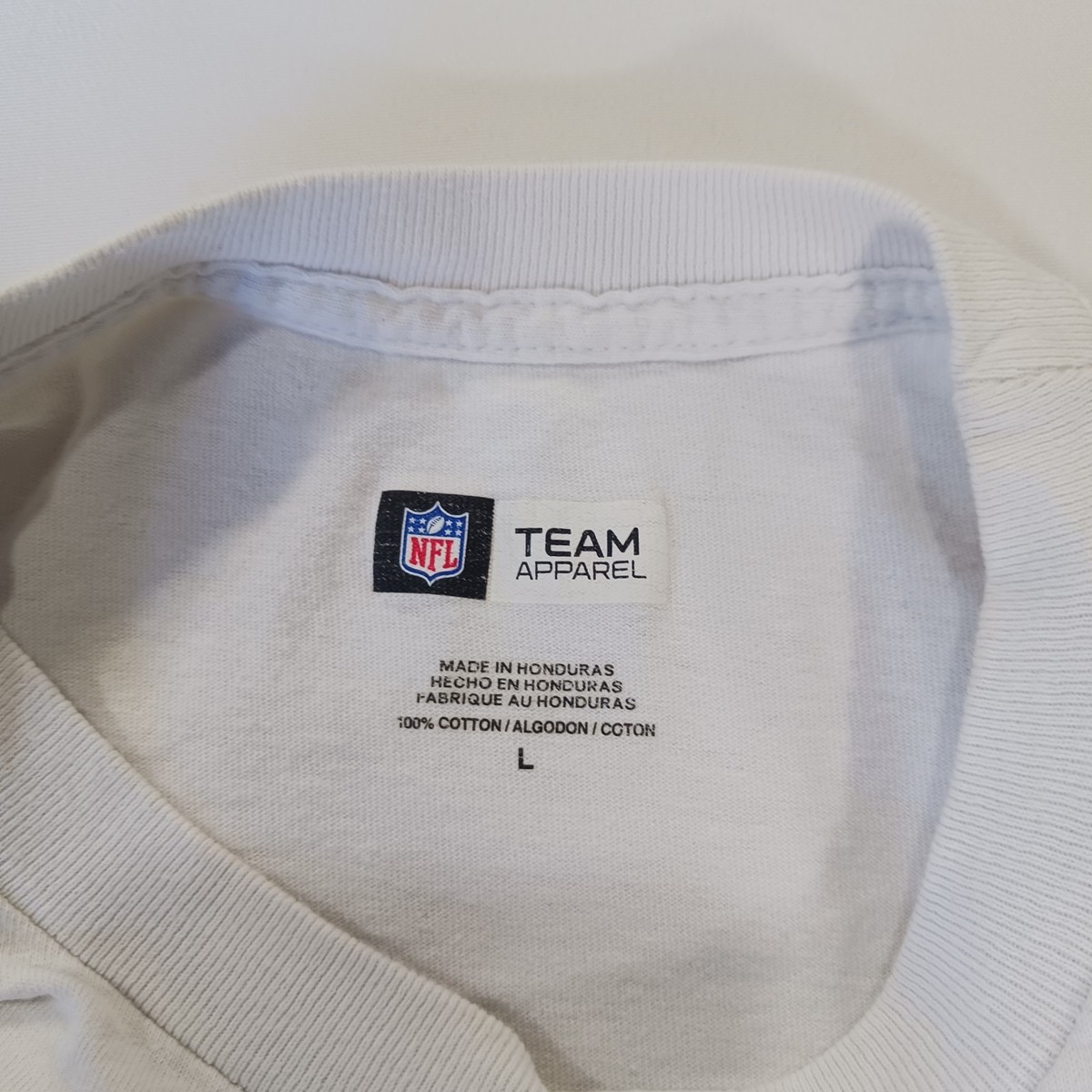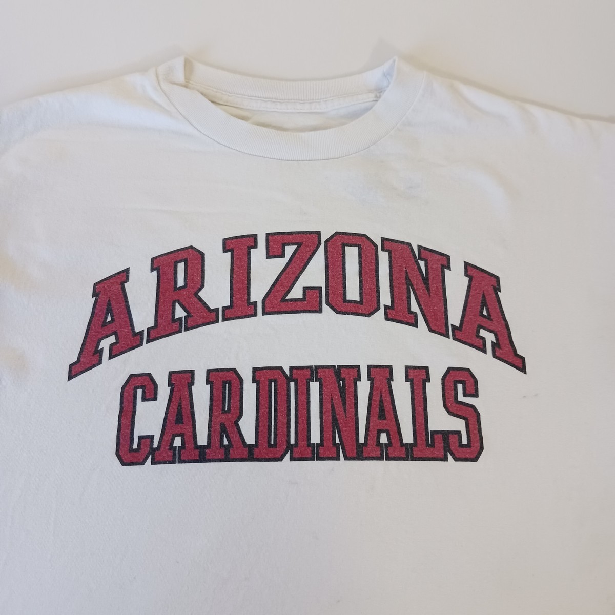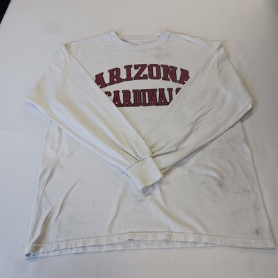 The product is an officially licensed NFL Team Apparel Arizona Cardinals men's white cotton long sleeve t-shirt in size L. This shirt is perfect for fans of the Arizona Cardinals and features the team's logo on the front. Made in Honduras, this shirt is ideal for wearing during the regular football season. The brand NFL Team Apparel ensures high-quality merchandise for supporters of the team. Perfect for displaying team spirit in style.