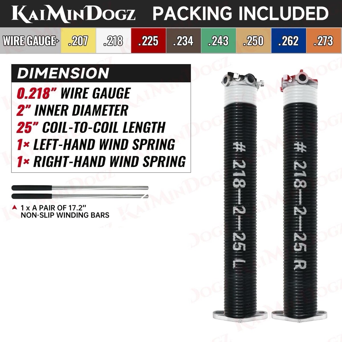 KaiMinDogz 2” Garage Door Torsion Springs Set 0.218 x 25” w/ Winding Bars