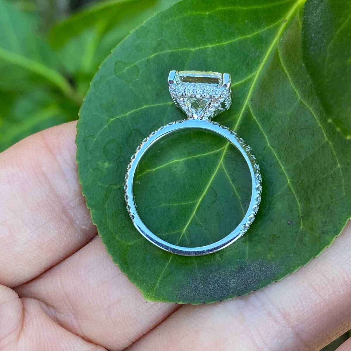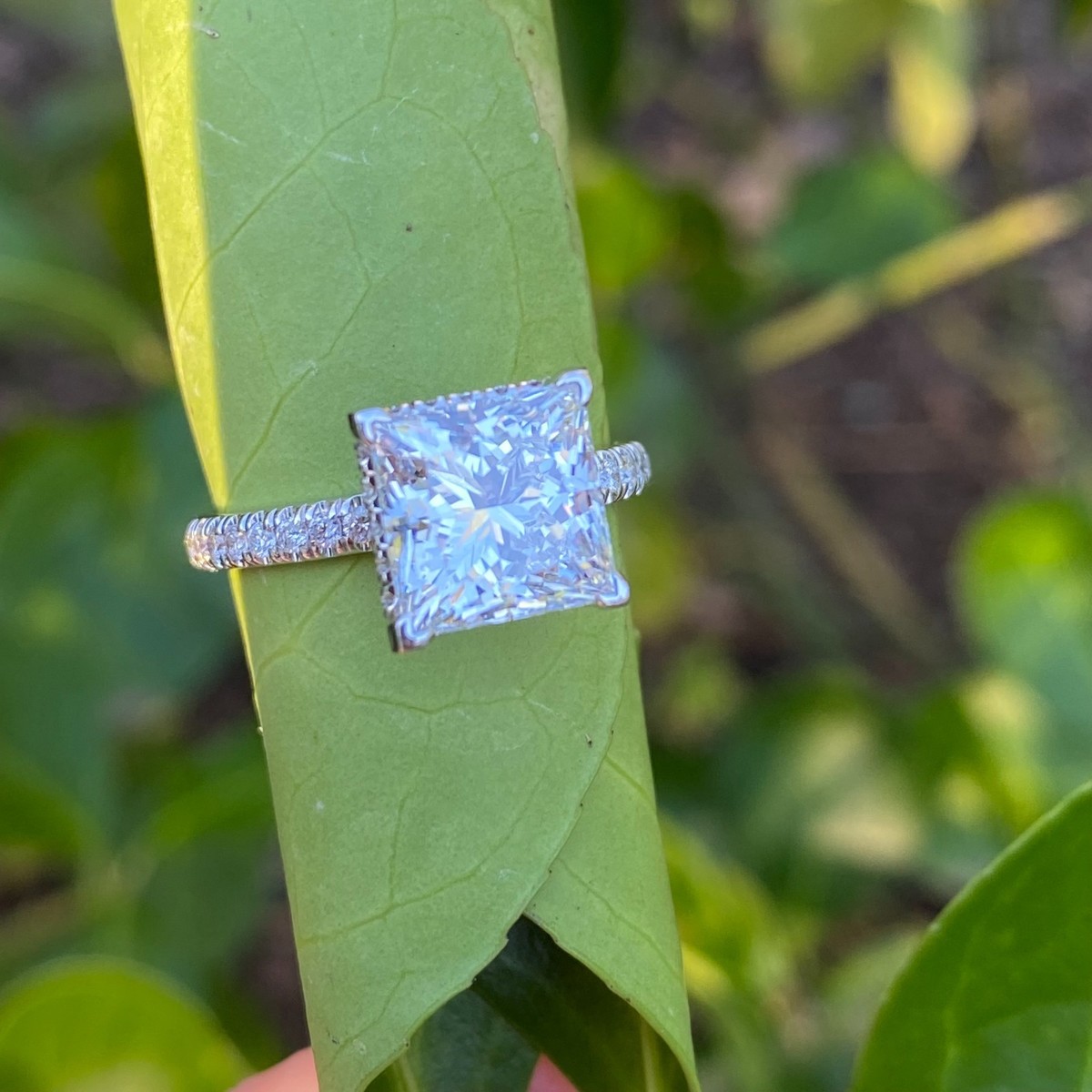 One of a kind engagement ring is featuring a 3.17 carat laboratory-grown diamond that has been certified by the Gemological Institute of America (GIA) and cut in an princess cut style. The ring has a hidden halo setting, where small diamonds surrounding the center stone are invisible from the top view. The lab grown diamond is a eco-friendly and sustainable choice, and the 18k white gold setting is a classic and durable metal for an engagement ring. The total carat weight is 3.90 carats. Our products are all hand made with quality and care, in the heart of the diamond district on 47th Street in New York City. Our dedication and commitment to fine work and quality exceeds all others. Since all of our products are handmade in the USA, every piece shares the same level of attention to detail