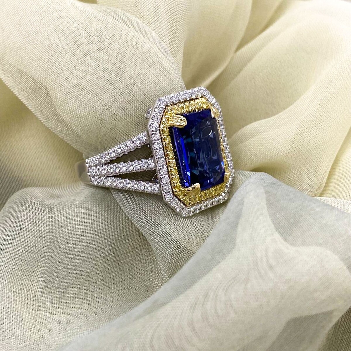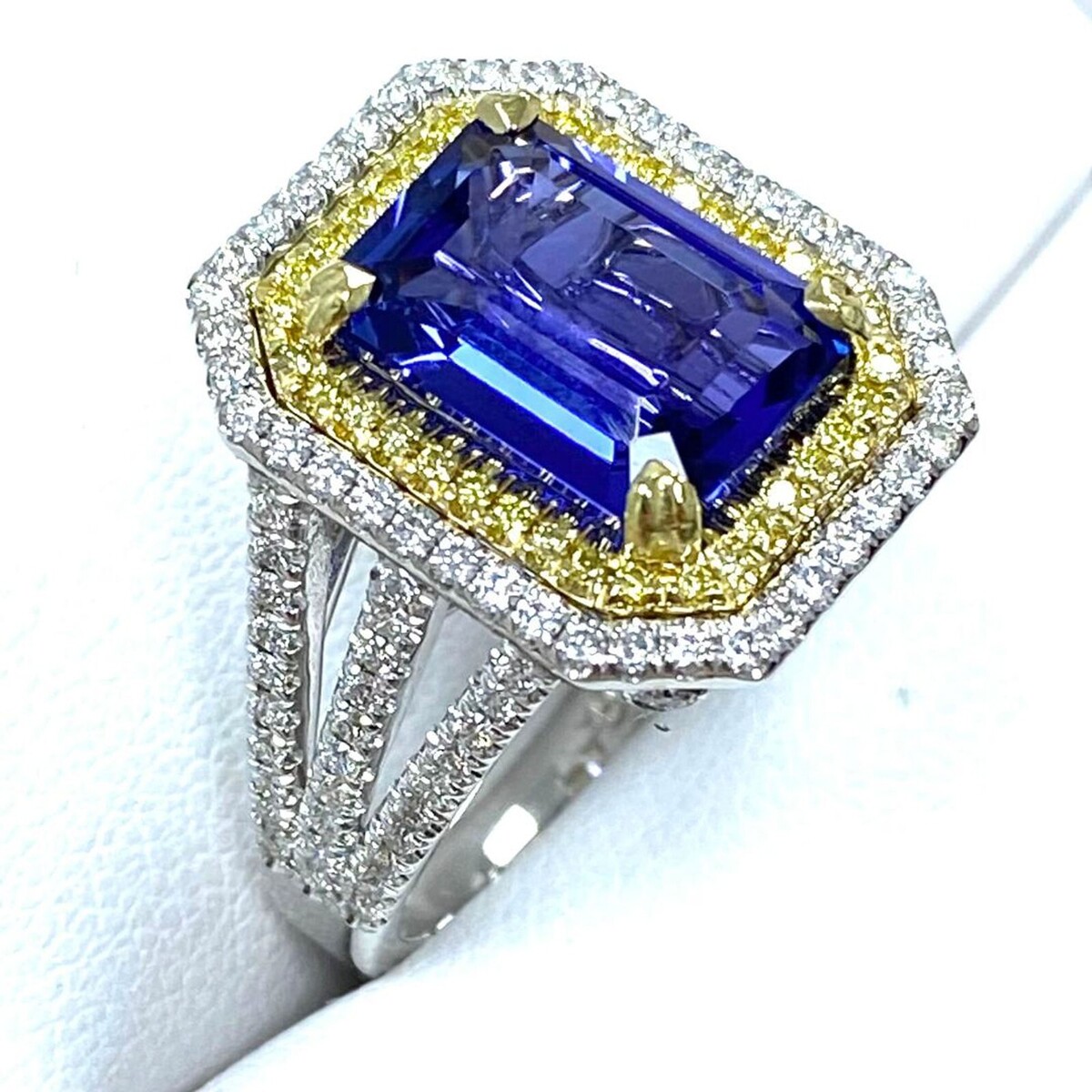 This stylish ring features a 4.18 carat GIA certified violet emerald cut tanzanite surrounded by a double halo of colorless and yellow round brilliant cut diamonds in micro pave setting. Additional diamonds line the triple split shank and under the gallery completing the shimmering elegance of this ring!!! The ring is crafted of 14-karat two tone gold that shines with a high polish finish. The total carat weight is 5.10 carats.