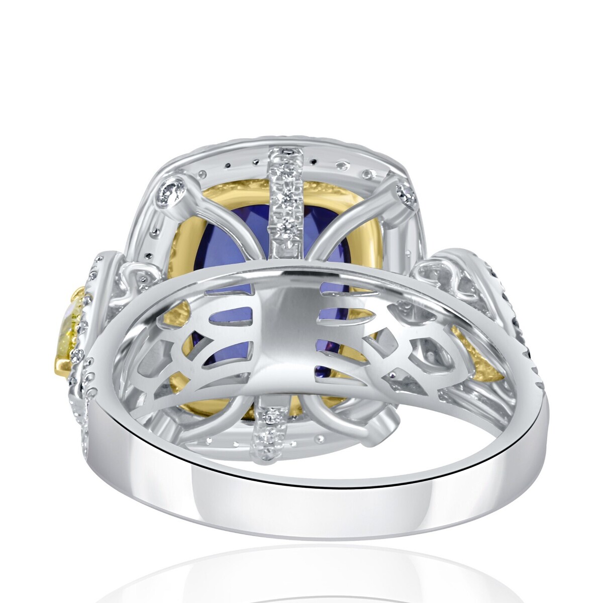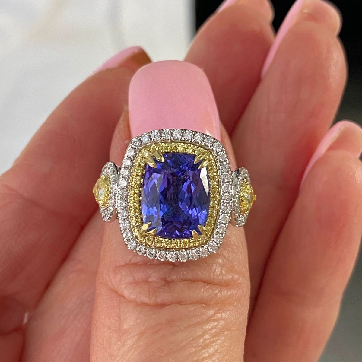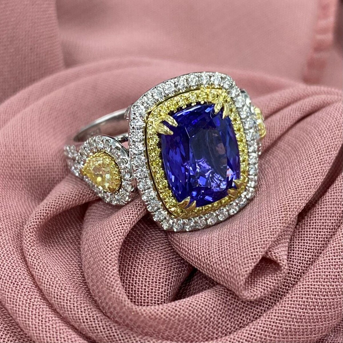 Ein GIA -zertifizierter 3,63 Karat Violet Kissen Brillant geschnitten Tansanit Diamant -Verlobungsring in 14 Karat Zwei -Ton -Gold mit 0,86 Karat runden brillante Schnitt weiße und gelben Seitendiamanten, mit 2 Birne Brilliant Cut Natural Fancy Yellow 0,62 CARAT Diamonds ist eine luxuriose und einzigartige Wahl für einen Verlobungsring !!! Die Zertifizierung gewahrleistet die Qualitat und Authentizitat der Steine, wahrend das Design eine schone Mischung aus Farben und Brillanz bietet. Das Gesamtkaratgewicht betragt 5,11 Karat.