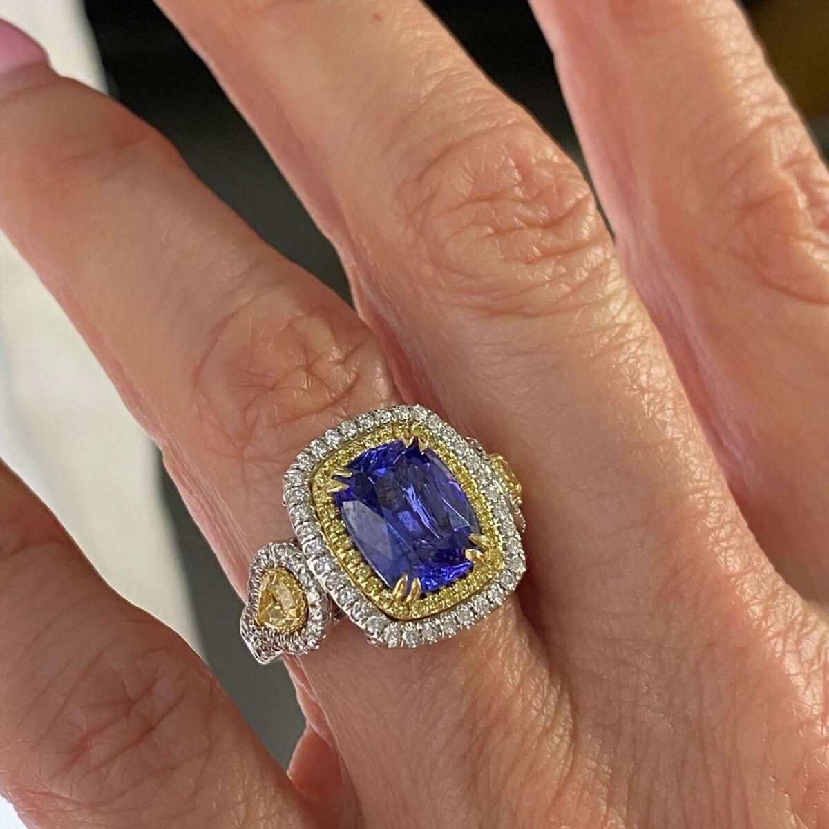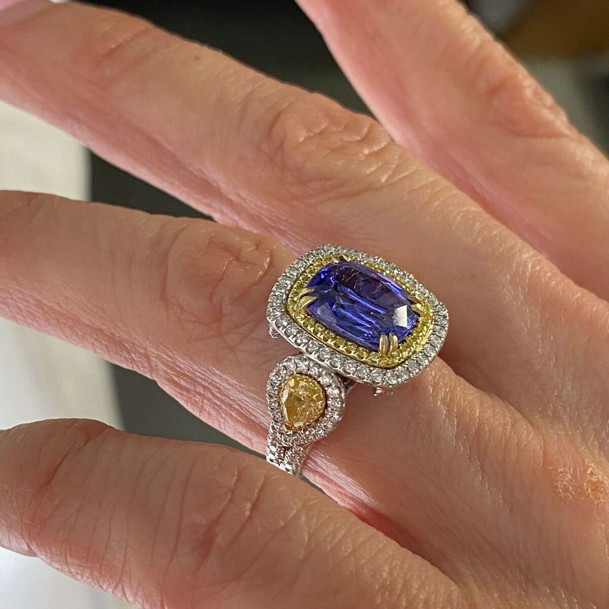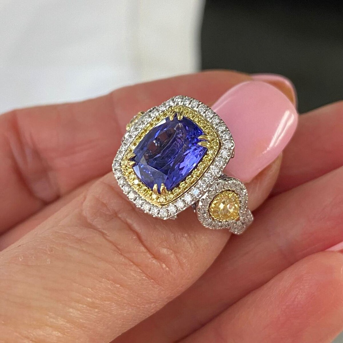 Ein GIA -zertifizierter 3,63 Karat Violet Kissen Brillant geschnitten Tansanit Diamant -Verlobungsring in 14 Karat Zwei -Ton -Gold mit 0,86 Karat runden brillante Schnitt weiße und gelben Seitendiamanten, mit 2 Birne Brilliant Cut Natural Fancy Yellow 0,62 CARAT Diamonds ist eine luxuriose und einzigartige Wahl für einen Verlobungsring !!! Die Zertifizierung gewahrleistet die Qualitat und Authentizitat der Steine, wahrend das Design eine schone Mischung aus Farben und Brillanz bietet. Das Gesamtkaratgewicht betragt 5,11 Karat.