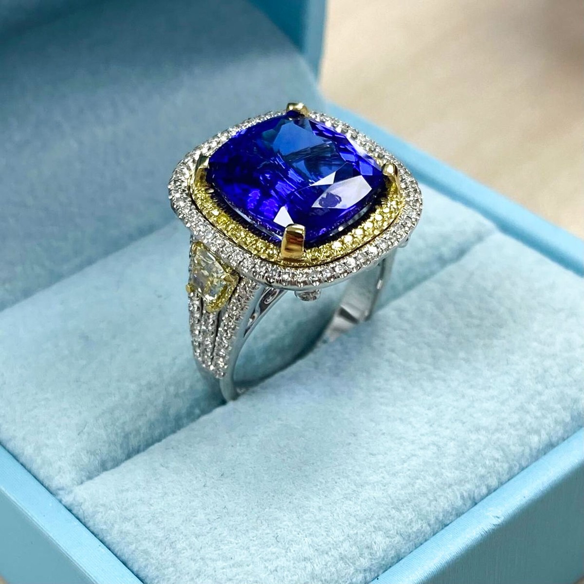El anillo de compromiso de diseño de Art Deco presenta un tanzanita de corte brillante de color violeta azul certificado de GIA de 8.68 quilates de tanzanita de corte brillante rodeado por un halo doble de diamantes naturales de corte brillante y amarillo de color amarillo en el entorno de micro pavimento. ¡Diamantes adicionales se alinean, el vastago triple dividido con 0.78 quilates 2 cortados con trapezoides diamantes naturales intensos naturales completando la elegancia brillante de este anillo! El anillo esta elaborado con oro de dos tono de 14 quilates que brilla con un acabado alto en polaco. El peso total de quilates es de 10.34 quilates. Todos nuestros productos estan hechos a mano con calidad y cuidado, en el corazon del Distrito de Diamantes en la calle 47 en la ciudad de Nueva