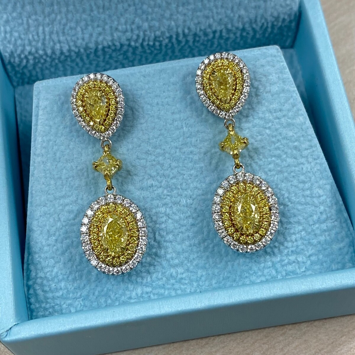 ¡Estos encantadores pendientes de moda agregaran magia a ese momento especial! Estos pendientes de caída colgante cuentan con piedras centrales de diamantes amarillos ovalo de 1,02 ct de diamantes amarillas rodeadas por un halo doble de diamantes de corte redondos incoloros y amarillos en micro pavimento con diamantes amarillos naturales de cojín y cortes de pera. Hecho a mano en oro de dos tonos de 18k. El peso total de quilates es de 2.95 quilates. Los pendientes se aseguran con el cierre del tornillo. Todos nuestros productos estan hechos a mano con calidad y cuidado, en el corazon del Distrito de Diamantes en la calle 47 en la ciudad de Nueva York. Nuestra dedicacion y compromiso con el buen trabajo y la calidad excede a todos los demas. Dado que todos nuestros productos estan hechos a