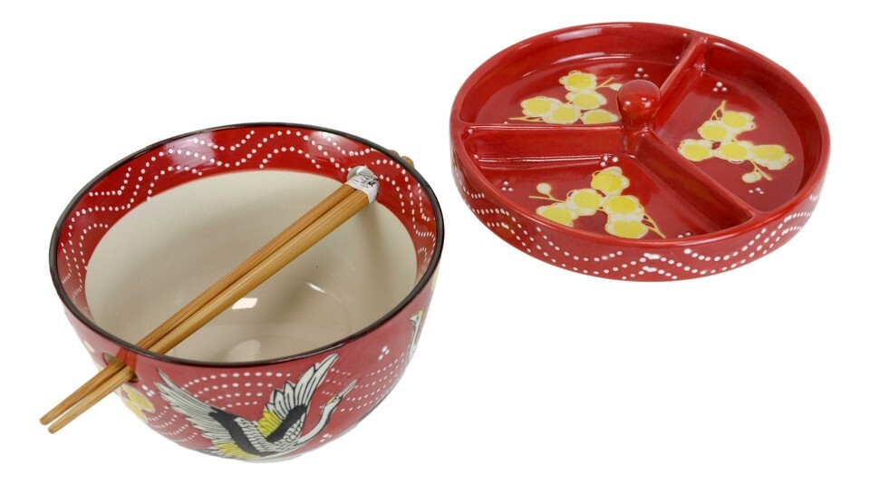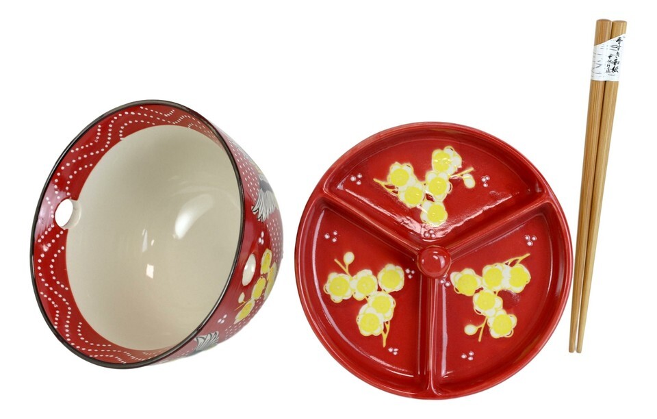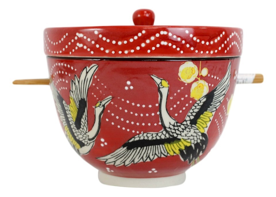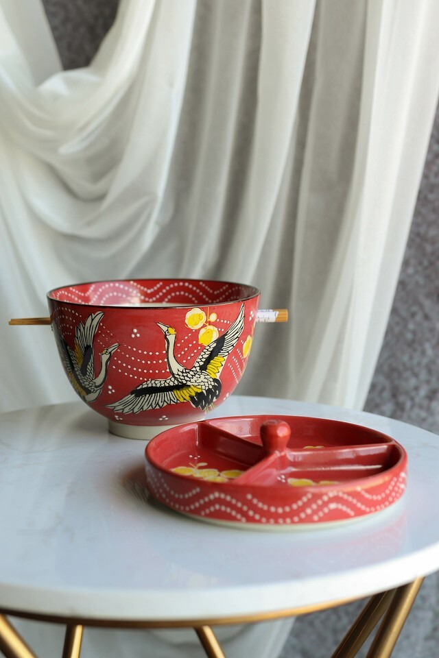 Red Flying Crane Ramen Bowl With Tempura Divider Condiment Lid Chopsticks Set