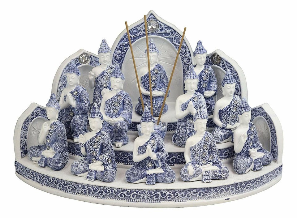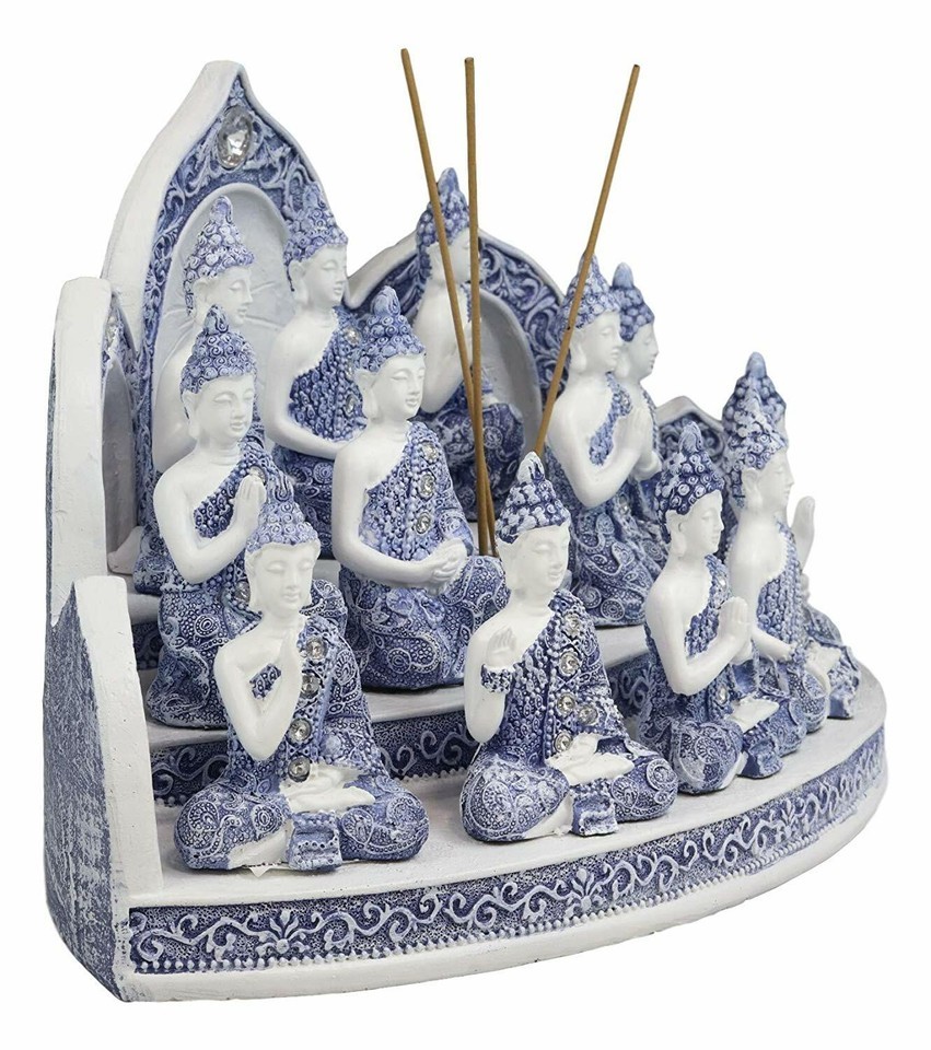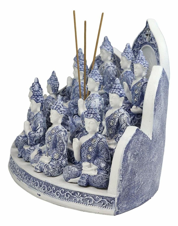 ? These Terracotta Blue And White 12 Meditating Buddha Amitabha Miniature figurines with the incense holder display stand set is made of designer composite resin, hand painted and polished individually. Color tone may vary from pictures.