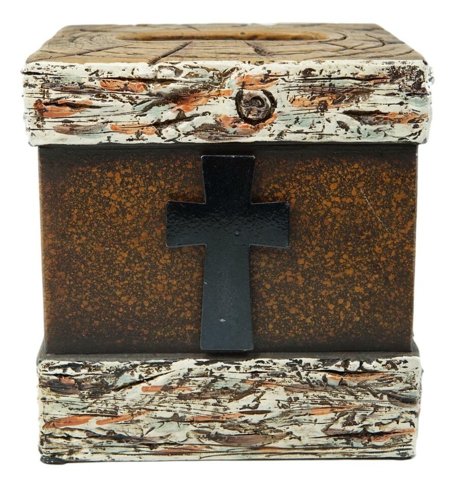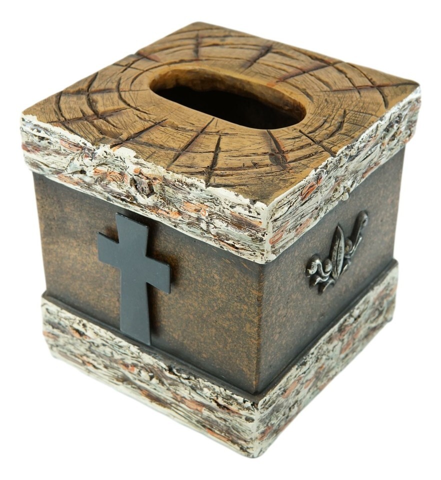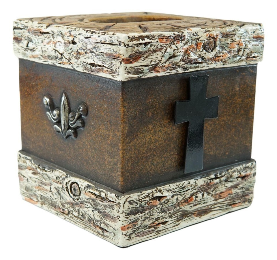 Ebros Rustic Western Fleur De Lis Cross With Birchwood Accent Tissue Box Holder Case