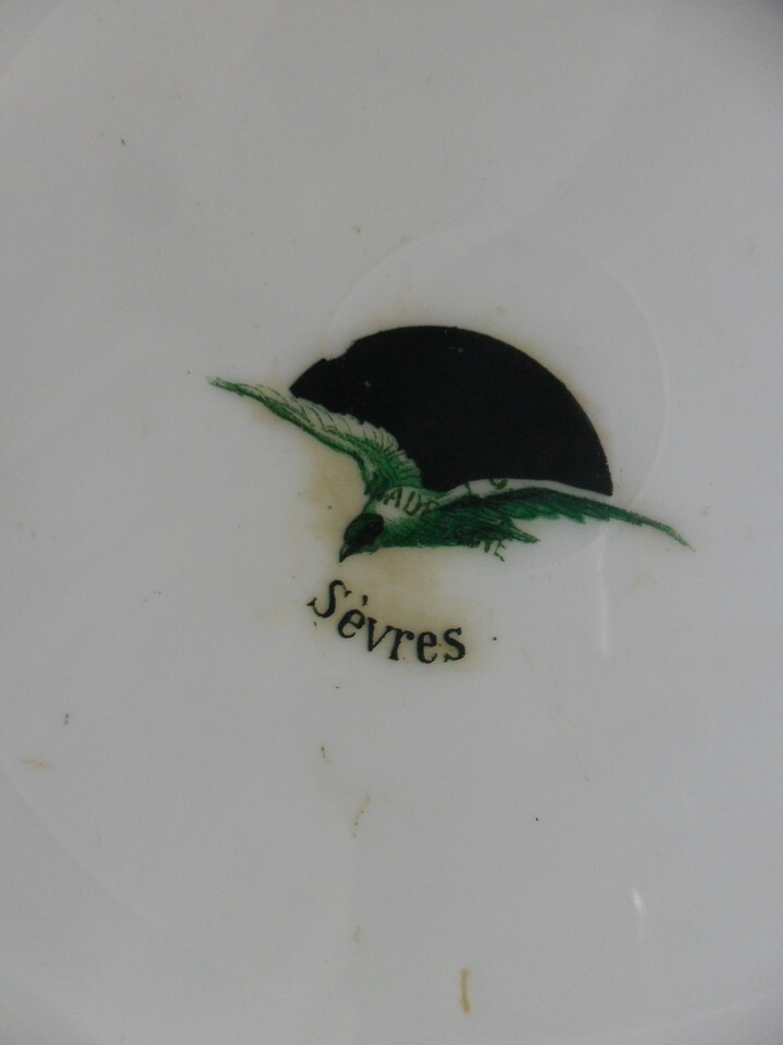 Sevres Guido Reni?s ?Aurora?, collector plate, cobalt blue and gold, signed, handpainted with mythological figures. Marked Sevres and there is a name under the impression "Madelaine". 10" diam. I could not find anything on this. "Aurora" was painted in about 1614, Casino dell'Aurora, Palazzo Pallavicini, Rome. This ceiling painting represents Apollo-Helios on the Chariot of the Sun Led by Aurora Followed by the Horae stands out in the mind of everyone who has visited the eternal city (Rome). It is painted on the ceiling of the garden house, or casino, of the Rospigliosi Palace. Though painted so long ago, yet it is as fresh in colouring as if its sportive creator had dipped his brush in yesterday morning?s sunlight, clear and bright, or in the barred purple and red and yellow of its gorgeous sunset. Certainly no other fresco of that now far-away time remains so perfectly preserved.