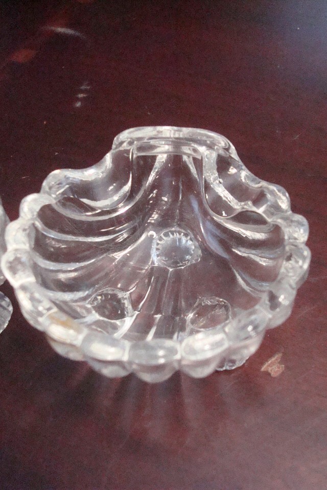 Glass pressed vintage pair of sald dishes, footed, shell shape, 1 1/2" tall by 3" by 3". very good condition, light surface scratches commensurate with age [A5-3b]