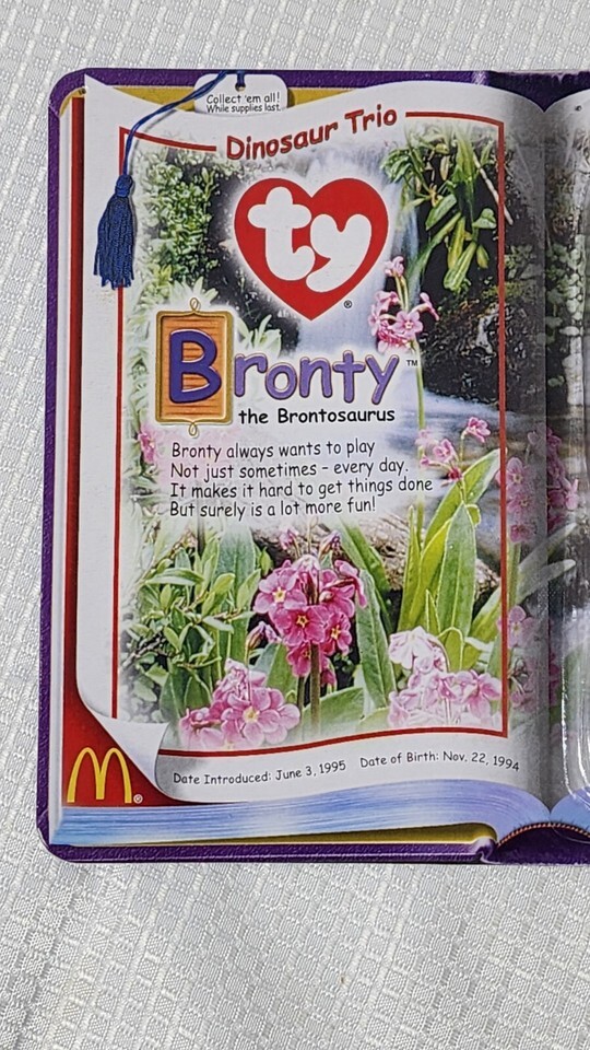 Description of item: This is a complete set of TY McDonald's Dinosaur Trio Teenie Beanie Babies released in 1995. The set includes Rex the Tyrannosaurus Rex, Bronty the Brontosaurus, and Steg the Stegosaurus. Each plush toy comes sealed in its original unopened storybook-style package, complete with original tags.