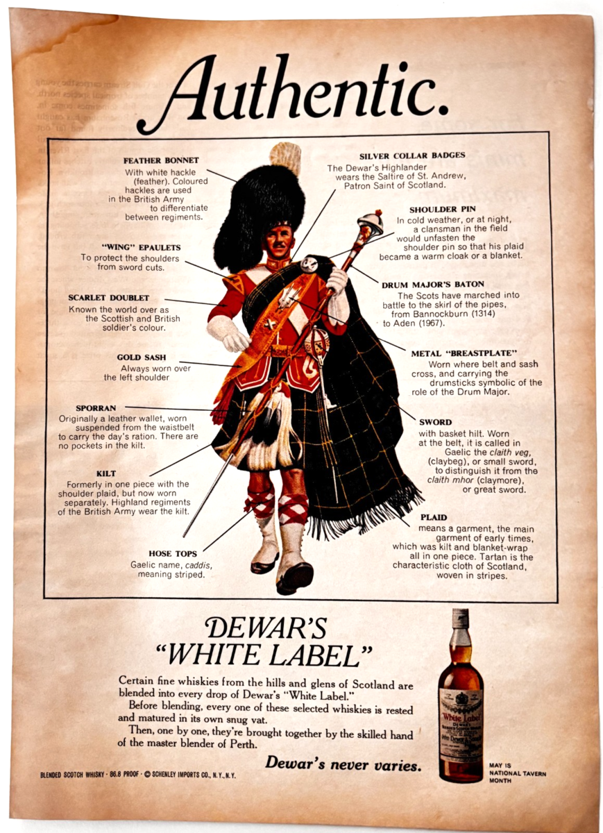 1970 Dewar's White Label Advertisement Traditional Scottish Kilt Uniform F15P