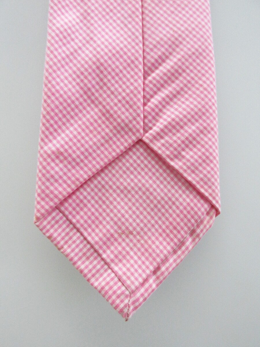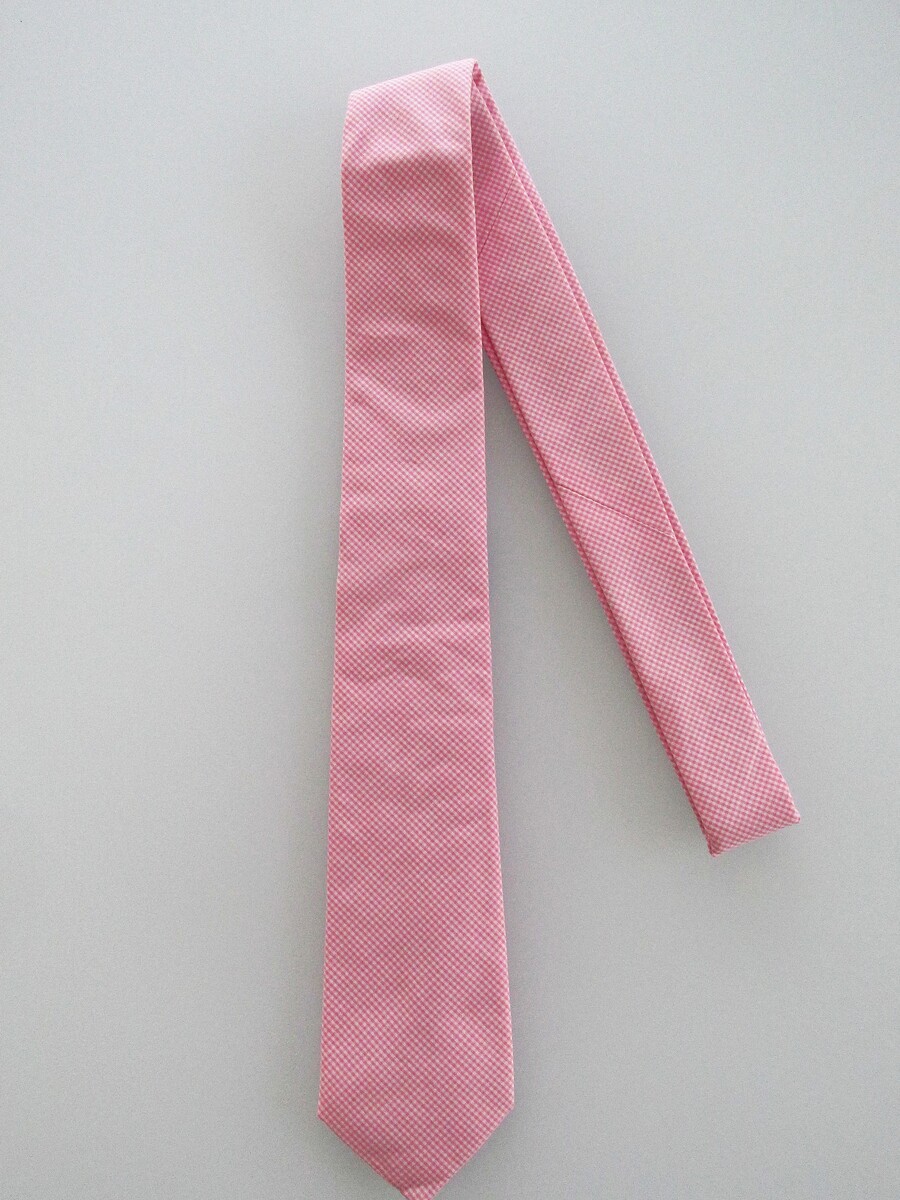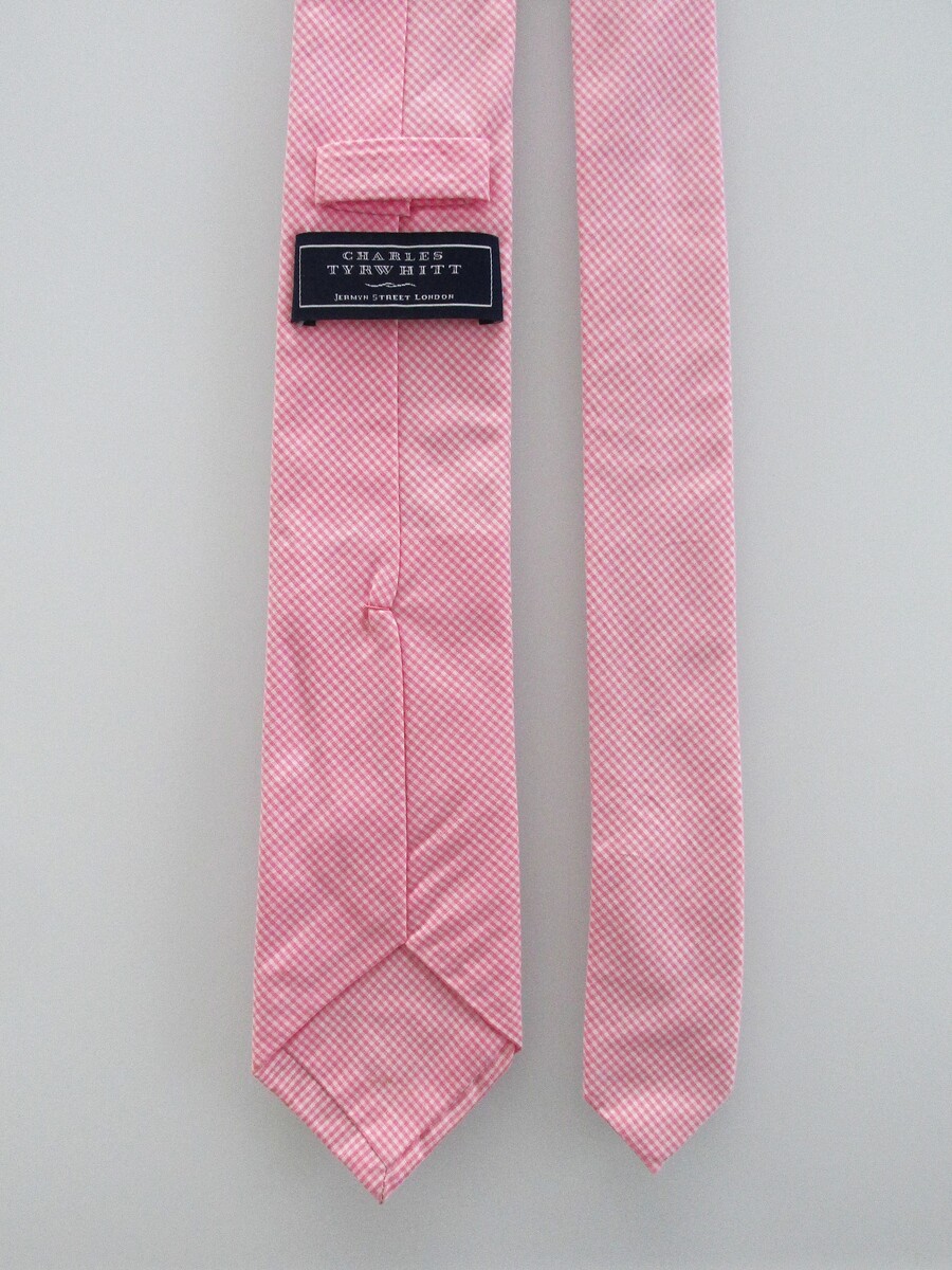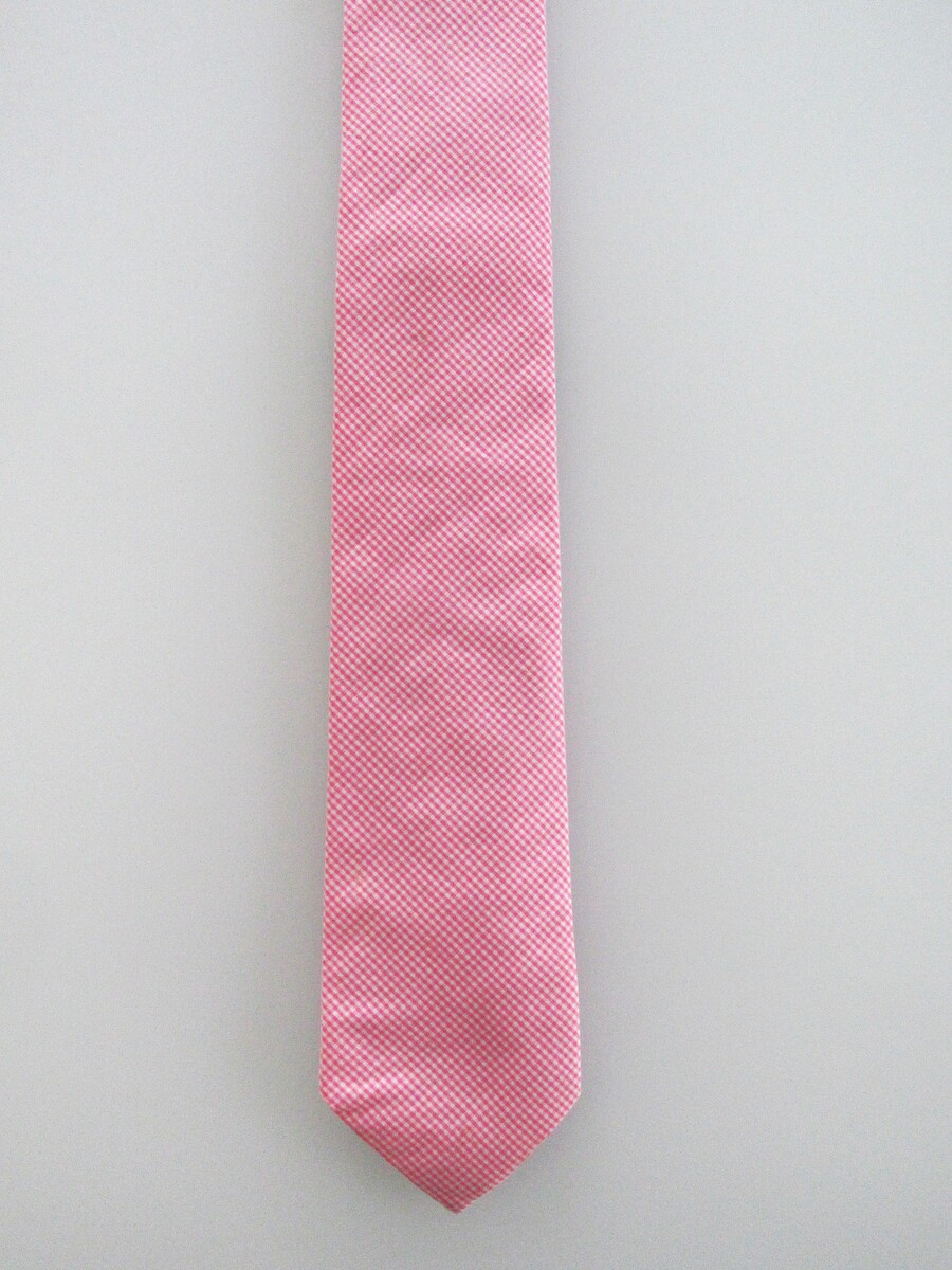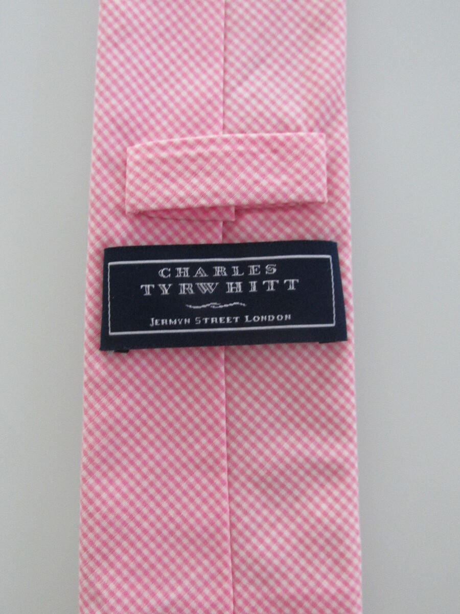 Description: Up for sale is a Charles Tyrwhitt men's narrow cotton tie. The tie is handmade in the England of 100% cotton. The tie has a soft pink white tiny check pattern. Dimensions are approximately 59" long x 2.75" wide. This tie is in like new condition.