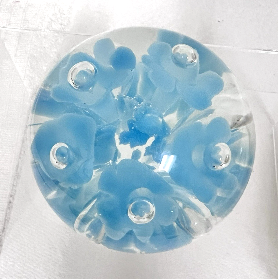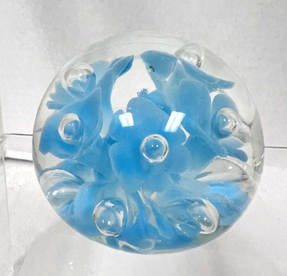 2000 Joe Rice Bright Blue Trumpet Flowers Paperweight Controlled Bubbles Glass about 2 5/8 inches