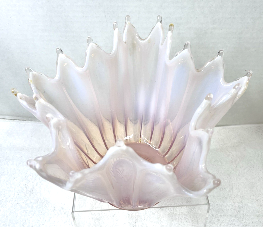Fostoria Heirloom Peach Pink Opalescent Glass Handkerchief Fluted Vase Bowl 6 3/4 Tall x about 9 inches across the widest area In great shape no chips flakes or breaks