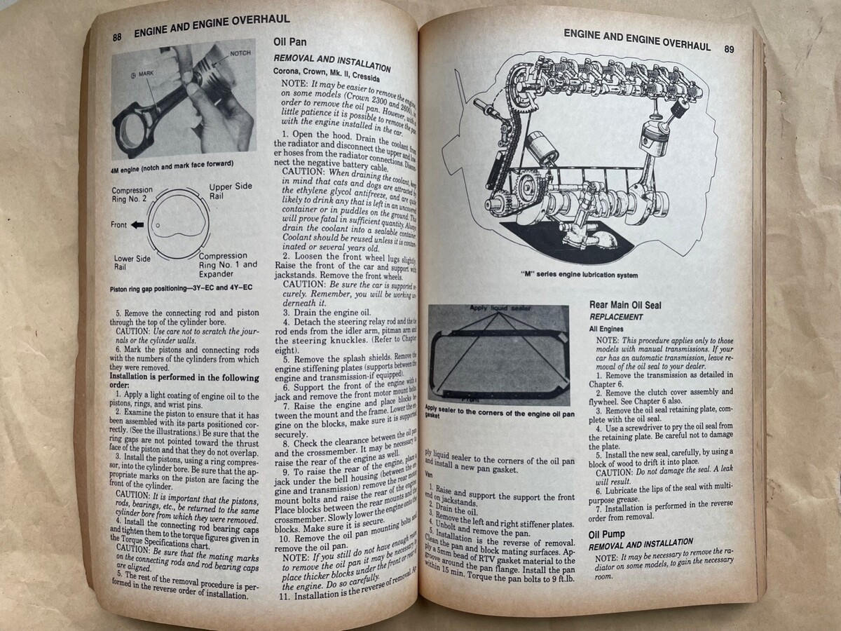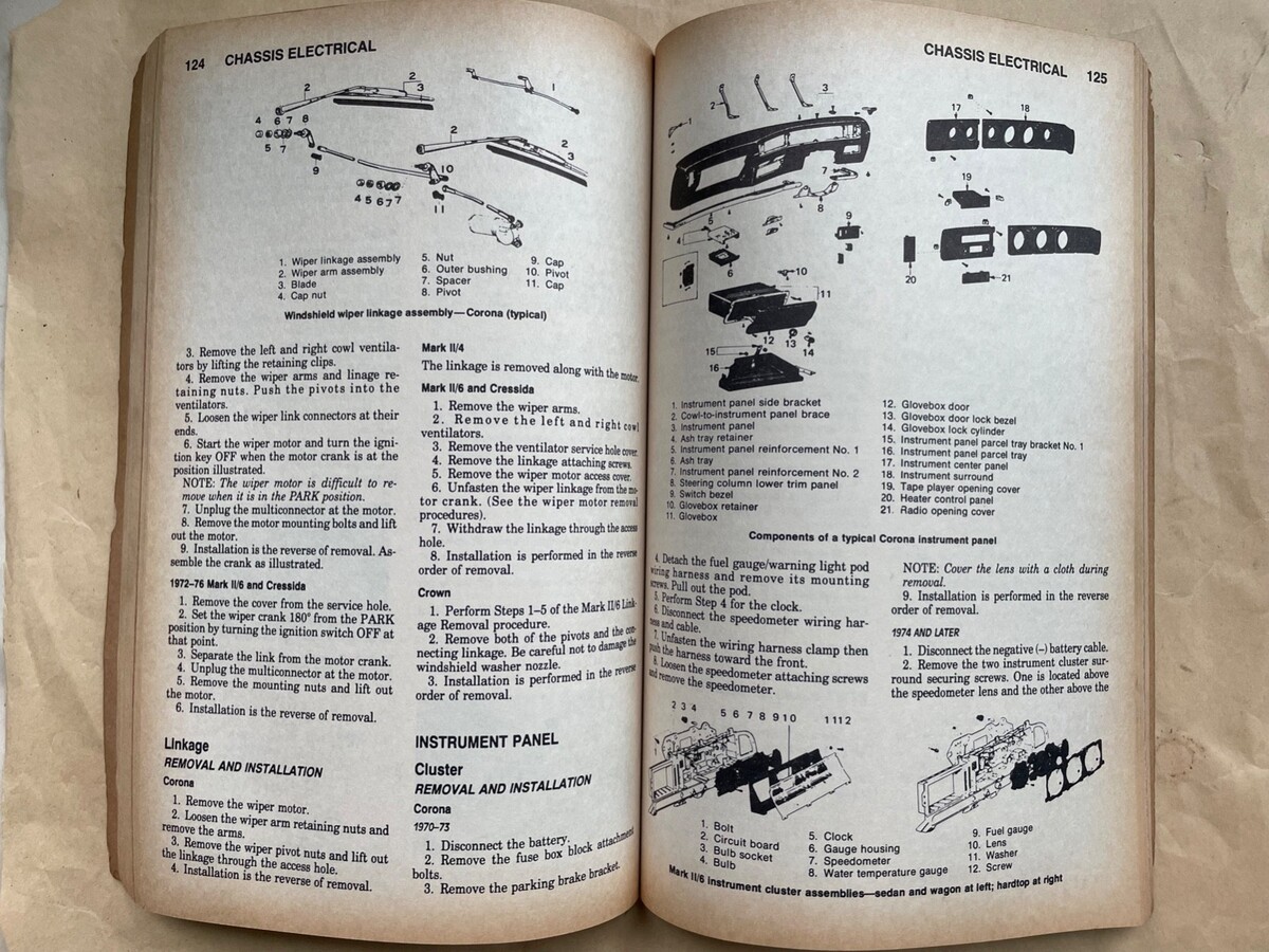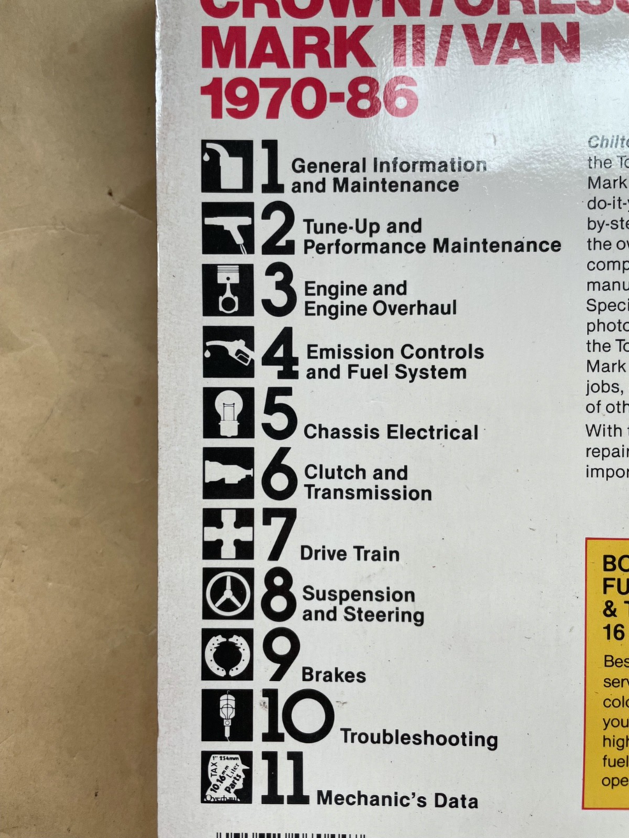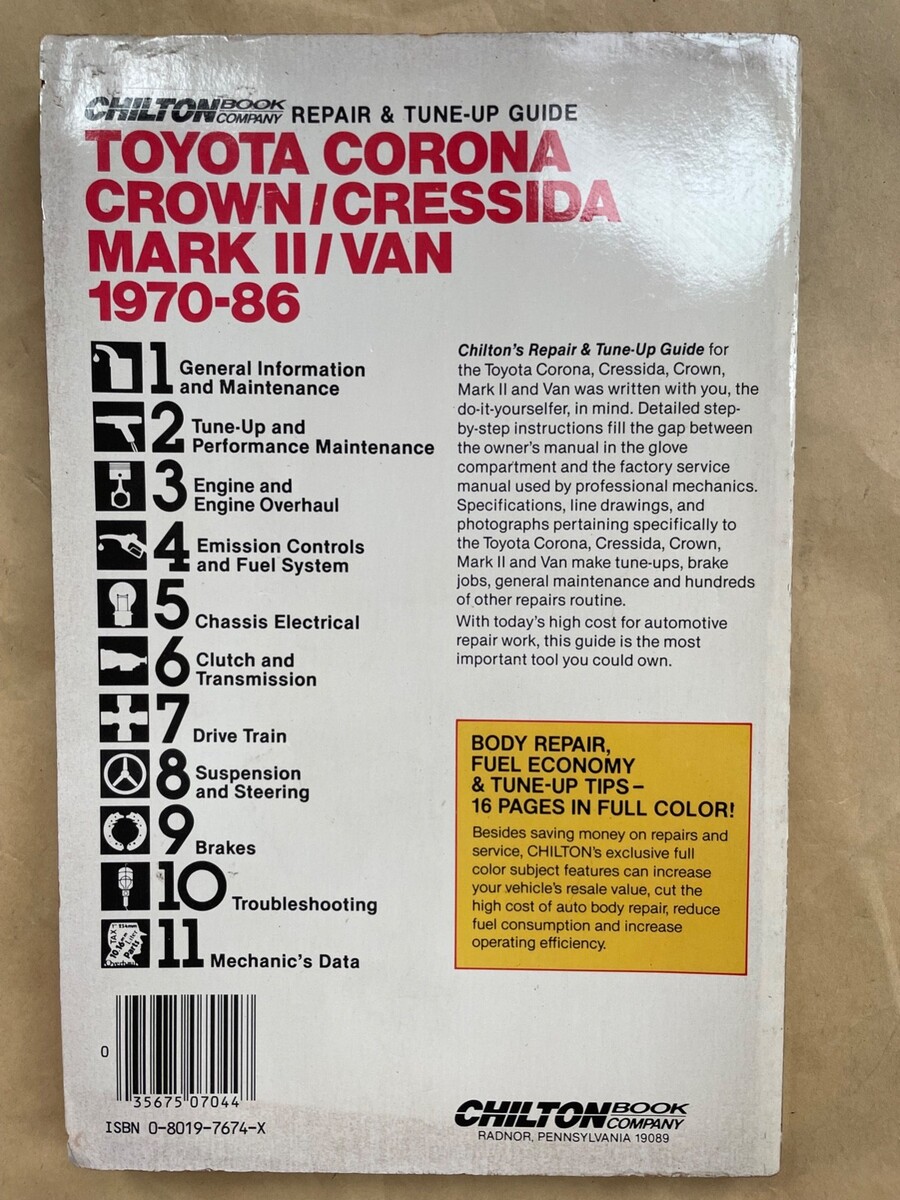 Toyota Corona, Crown, Cressida, Mark II Van 1970-1986 Repair Manual. See last Pic for the repair categories covered. All pages are there, and No greasy fingers have touched these inner pages. Published by Chilton's. Repair Tune-up Guide.