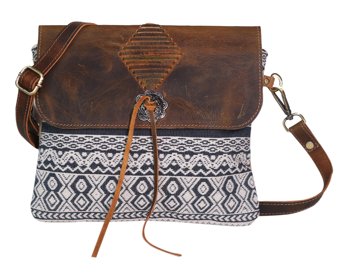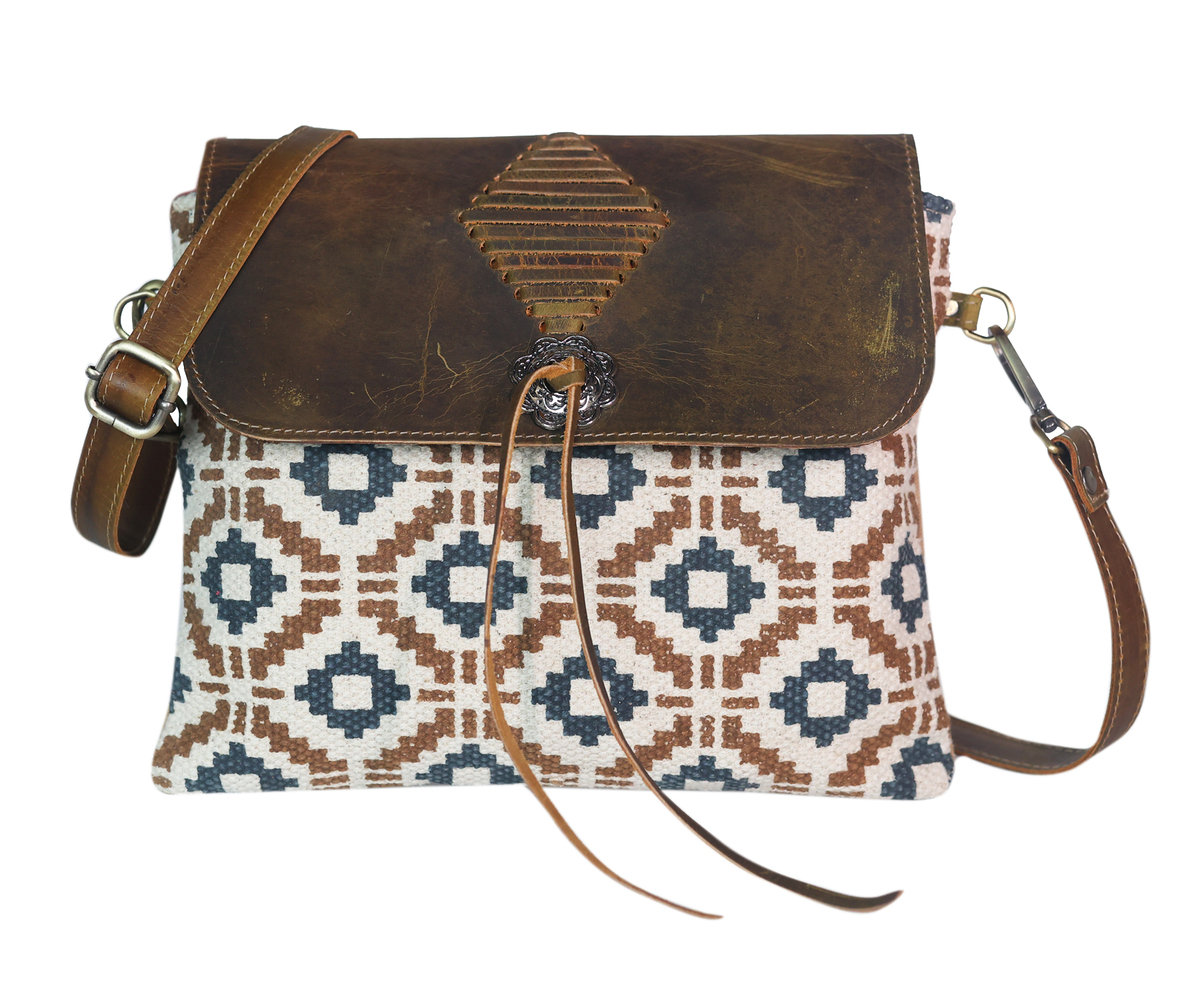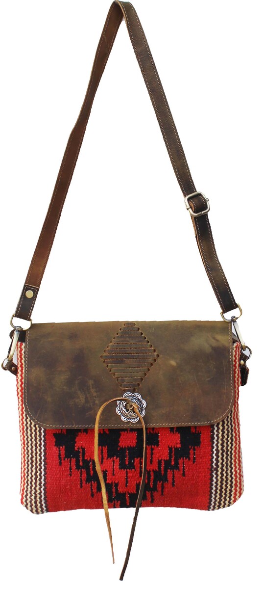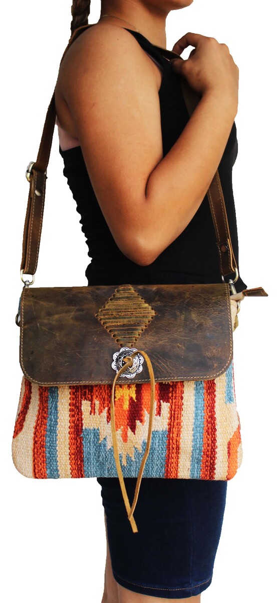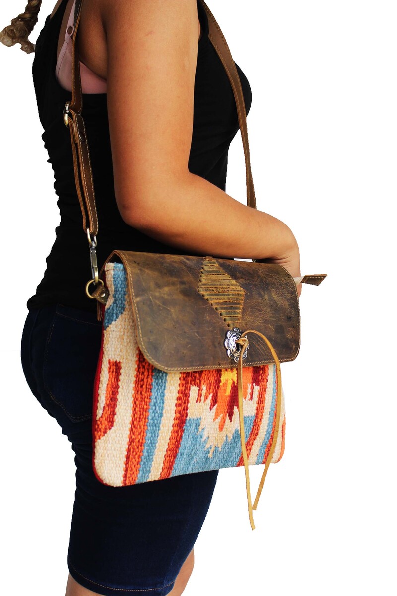 Challenger women's handbag made from handwoven wool and upcycled canvas, with distressed brown full-grain leather accent. Shoulder bag features a beautiful multicolor southwest design. This practical, lightweight, and conveniently sized roomy bag is made sturdy to endure everyday use. Includes a removable shoulder strap. Perfect choice for travel, school, work, or weekend trips. Main compartment has a full zipper closure that ensures your belongings are kept safe. The fully lined interior also features a side zippered pocket for additional storage. On the outside you have a back zippered pocket on the back of the bag. The antique finish brass hardware and silver engraved concho nicely ties the bag together. Bag measures 11" L x 8.5" H providing plenty of room for all of your everyday essentials.