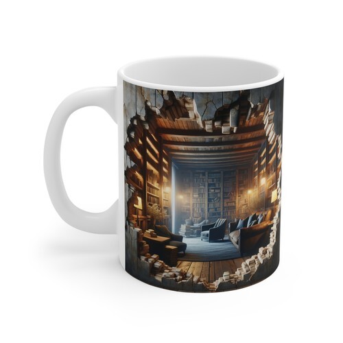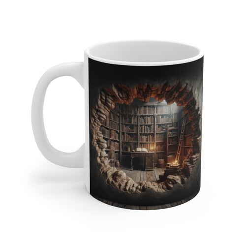 Warm, quiet, and a little bit secretive ? this ceramic mug brings the hush of a hidden reading nook to every morning. Rich, detailed artwork wraps around the glossy white surface: a snug cave-like alcove lit by a single candle, an open book waiting on a wooden table, and the soft shadows of tucked-away tomes. Hold it and feel like you?ve escaped to a private corner where pages turn slowly and the world dims to the glow of thought. The sturdy C-handle and shiny finish make it comfortable to cradle during long reading sessions or late-night study bursts. Available in two sizes to match the length of your ritual: a quick espresso-style pick-me-up or a generous cup to sip through a whole chapter.