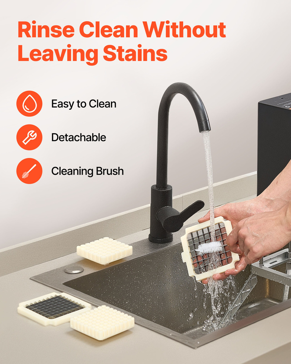 Easy to Clean: Made from heavy-duty stainless steel and aluminum alloy, this vegetable dicer is durable and resistant to corrosion. The stainless steel blades are detachable for easy cleaning with the included brush, extending the cutterโs lifespan