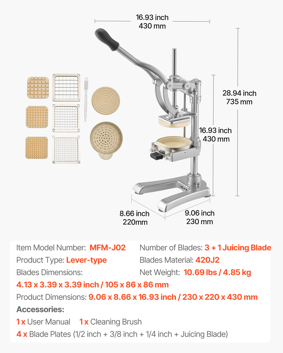 Upgraded Blades: This French fry cutter features 420J2 stainless steel blades in 1/4", 1/2", 3/8" sizes, and a juicing blade plate. Easily cuts potatoes, carrots, and more. For hard food like sweet potatoes, microwave them first for smoother cuts