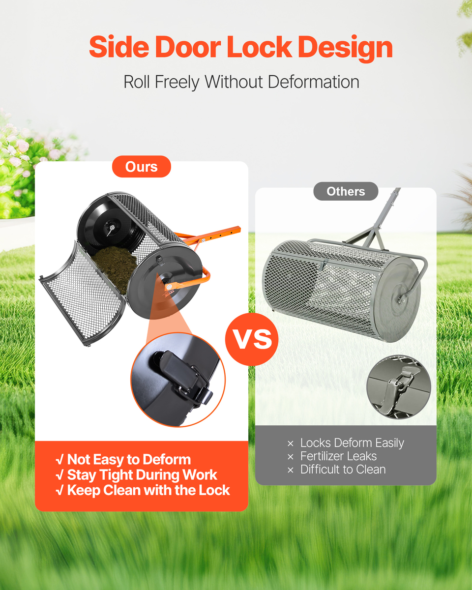 Large Capacity Drum: The 24-inch peat moss roller holds up to 2.66 cubic feet of material, reducing the need for frequent refills. Load it once with grass seed, compost, or soil conditioner to cover large areas quickly and easily.
