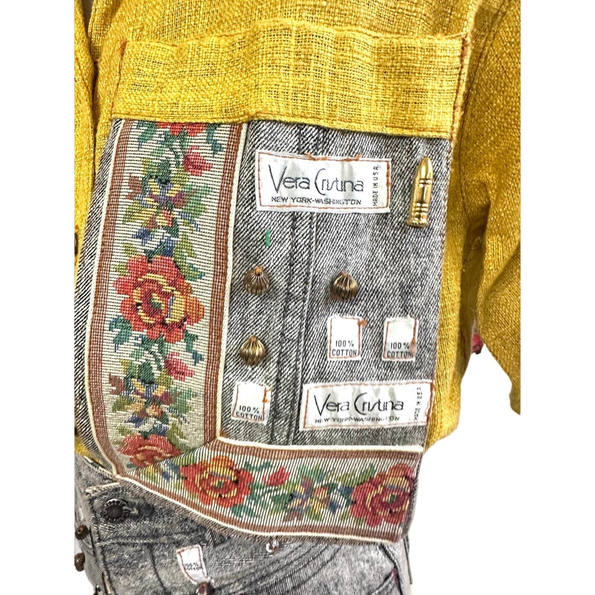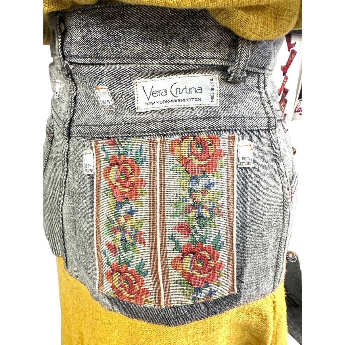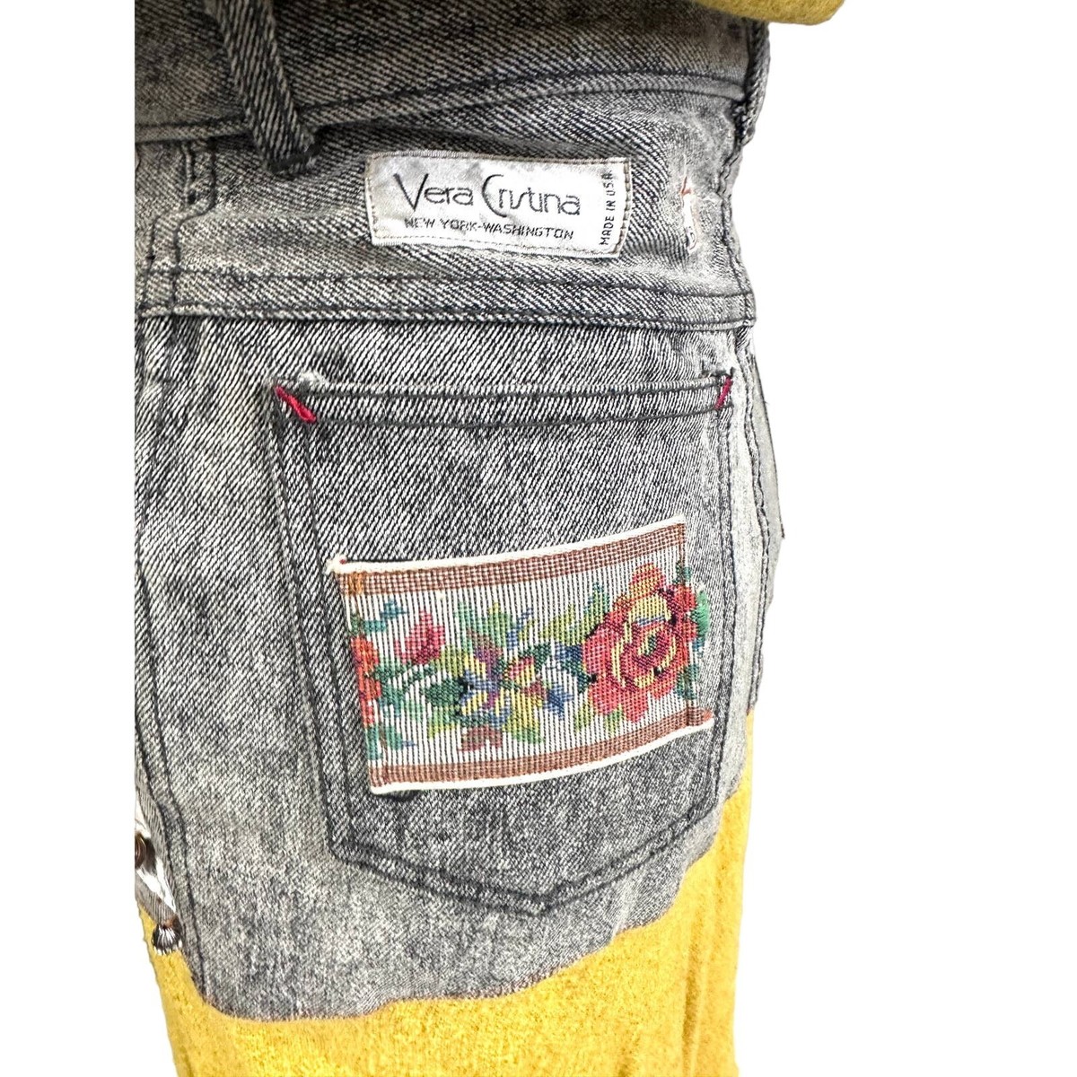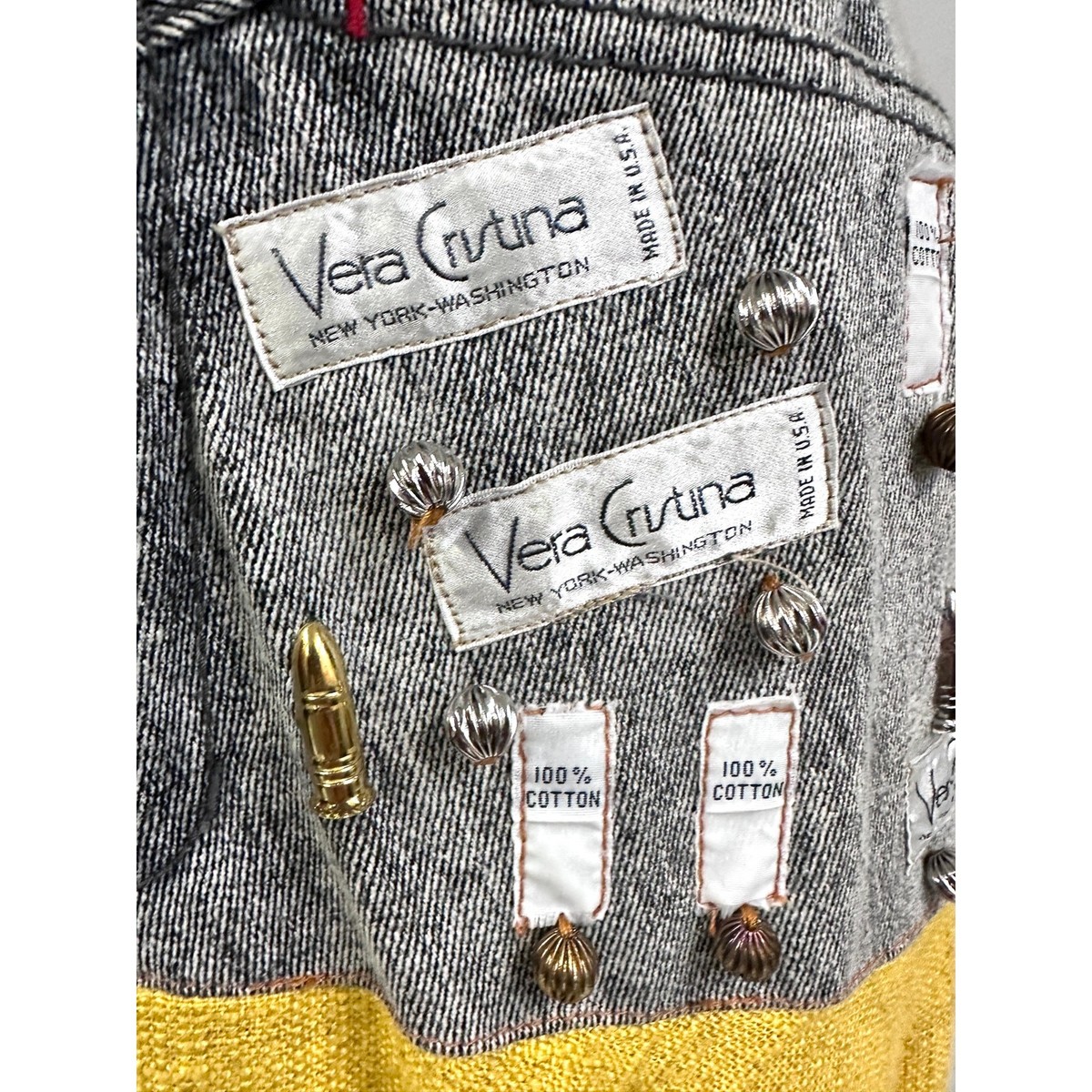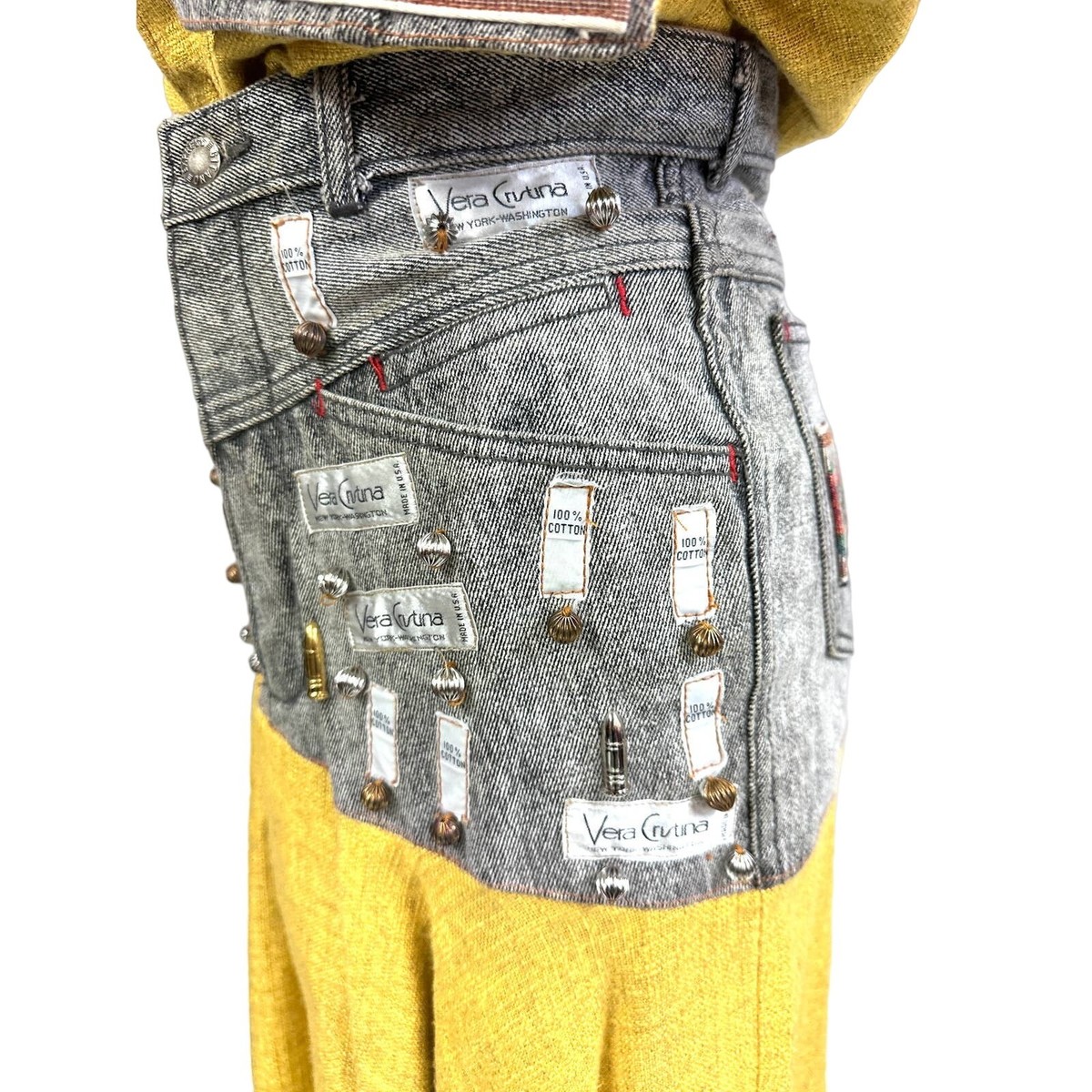 Vera Cristina NY VTG 1980s Skirt & Top Set Yellow Linen Gray Denim Beaded Sz M