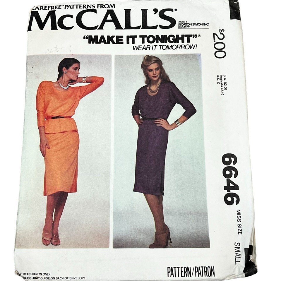 Vintage McCall's 6646 Misses' Dress Sewing Pattern Size S Two Designs
