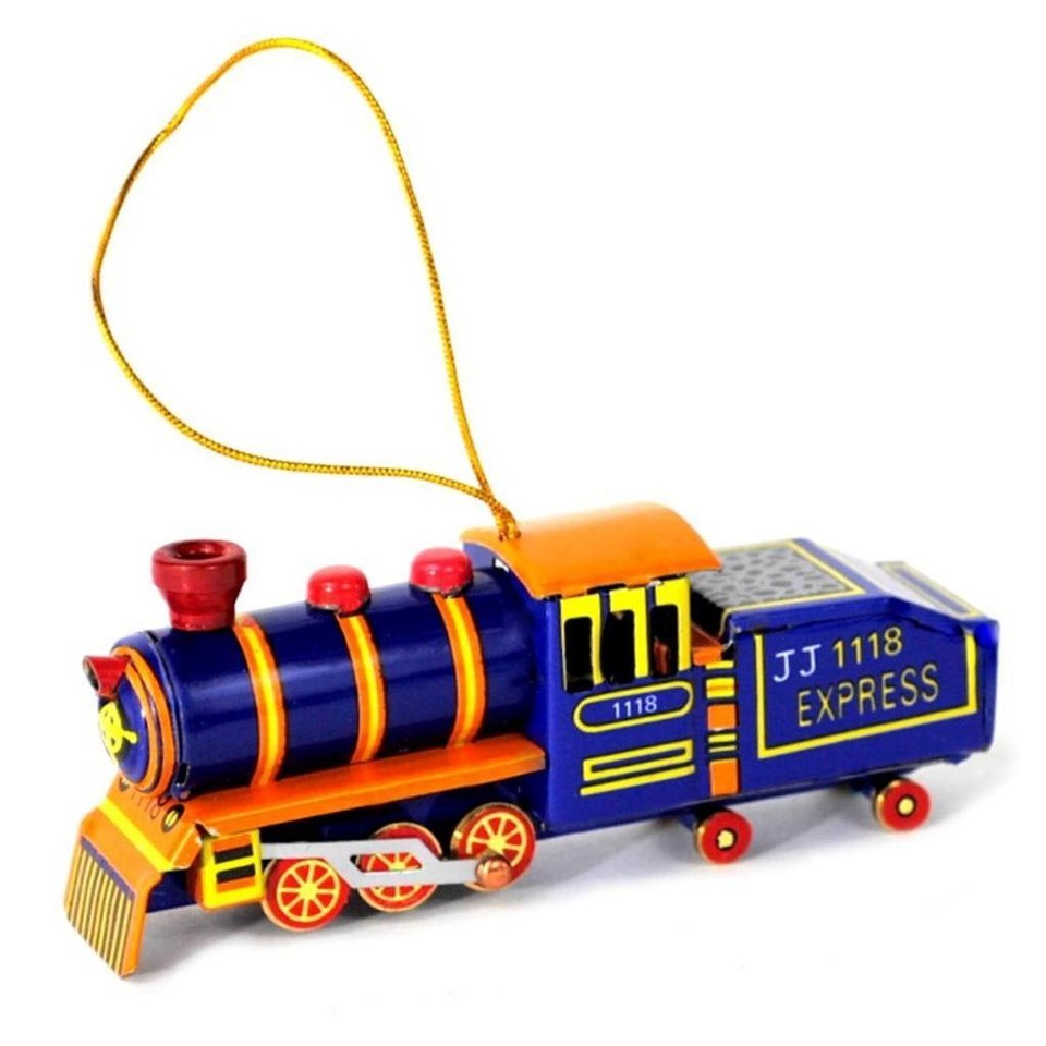 These whimsical tin toys are vintage style ornaments with charming detailed lithographs.