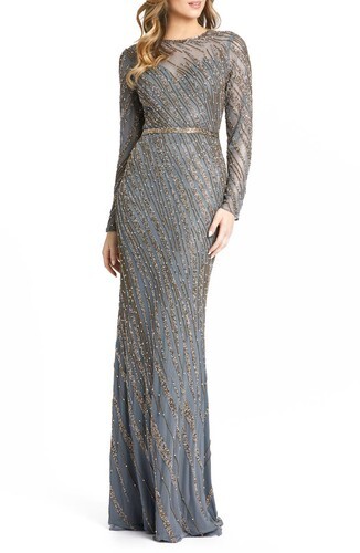 Mac Duggal 5240D Beaded Long Sleeve Column Gown Sz 6 Platinum Mrsp $598