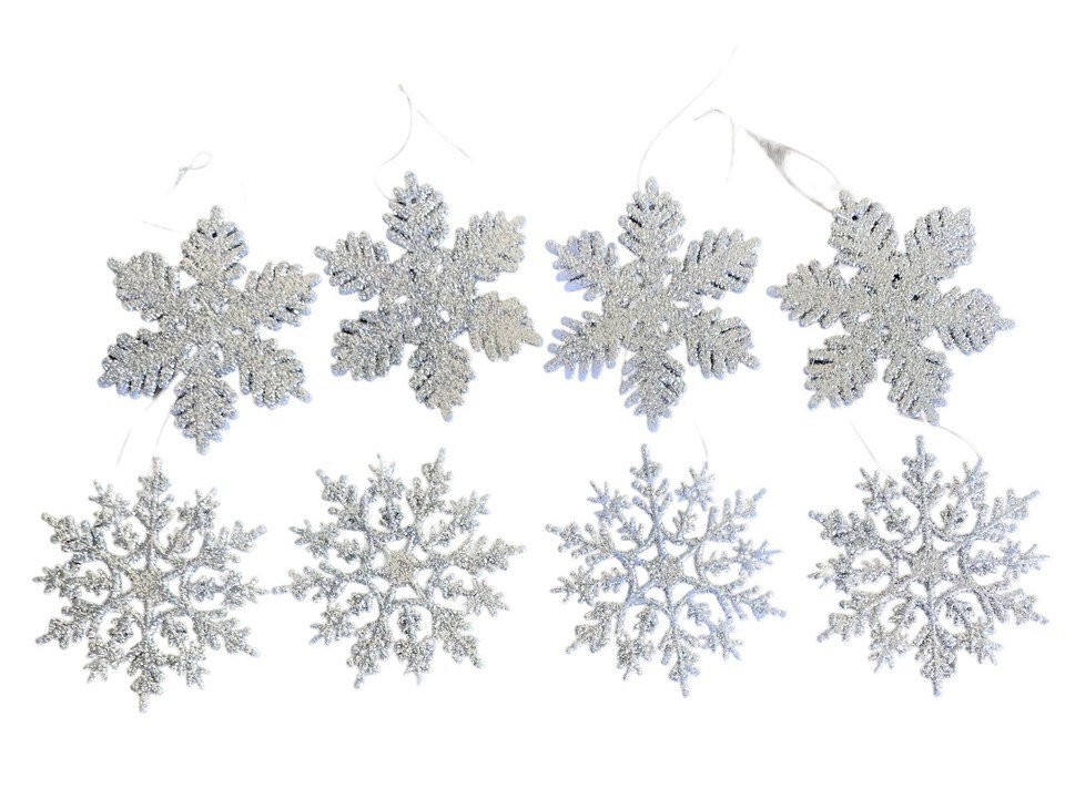 Lot of 8 plastic snowflake ornaments with silver glitter.