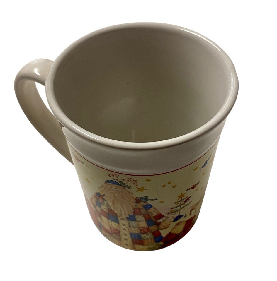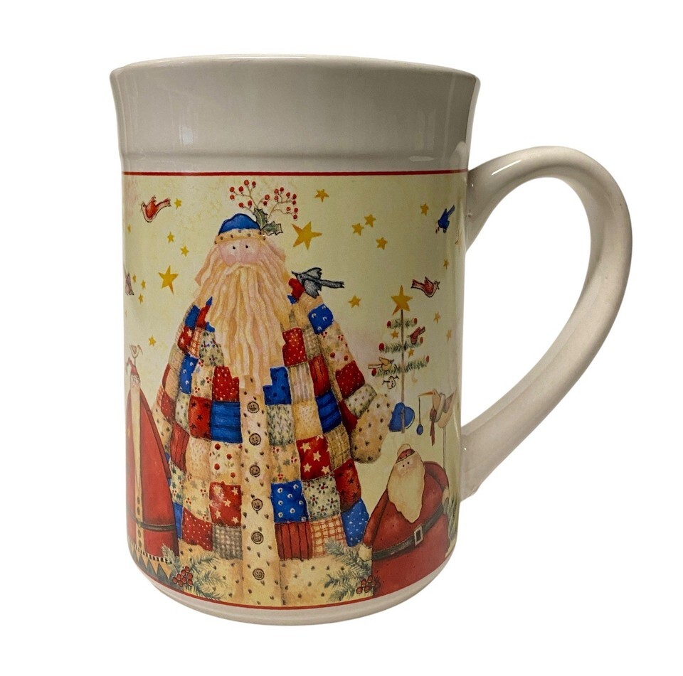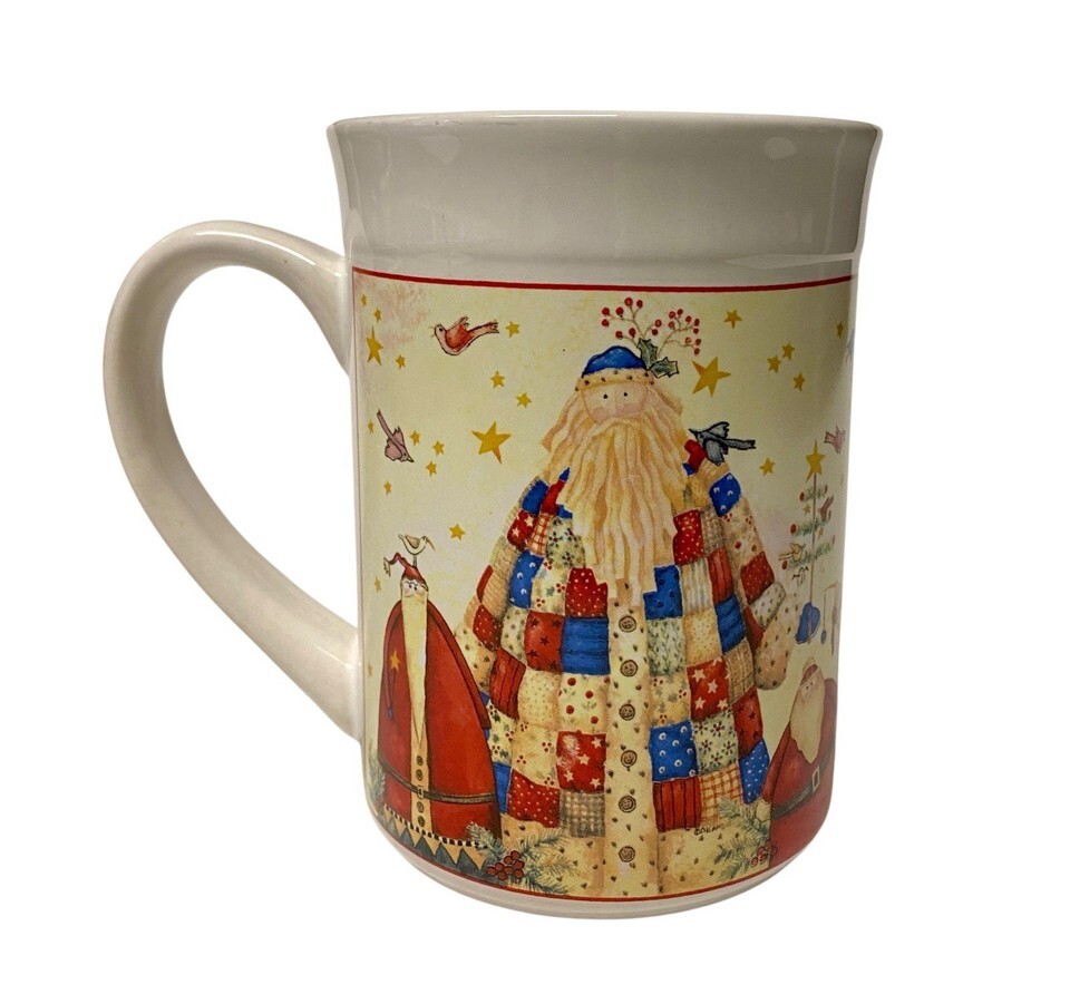 Debi Hron Christmas Mug Folk Art Santa Patchwork Quilted Coat Coffee Cup New