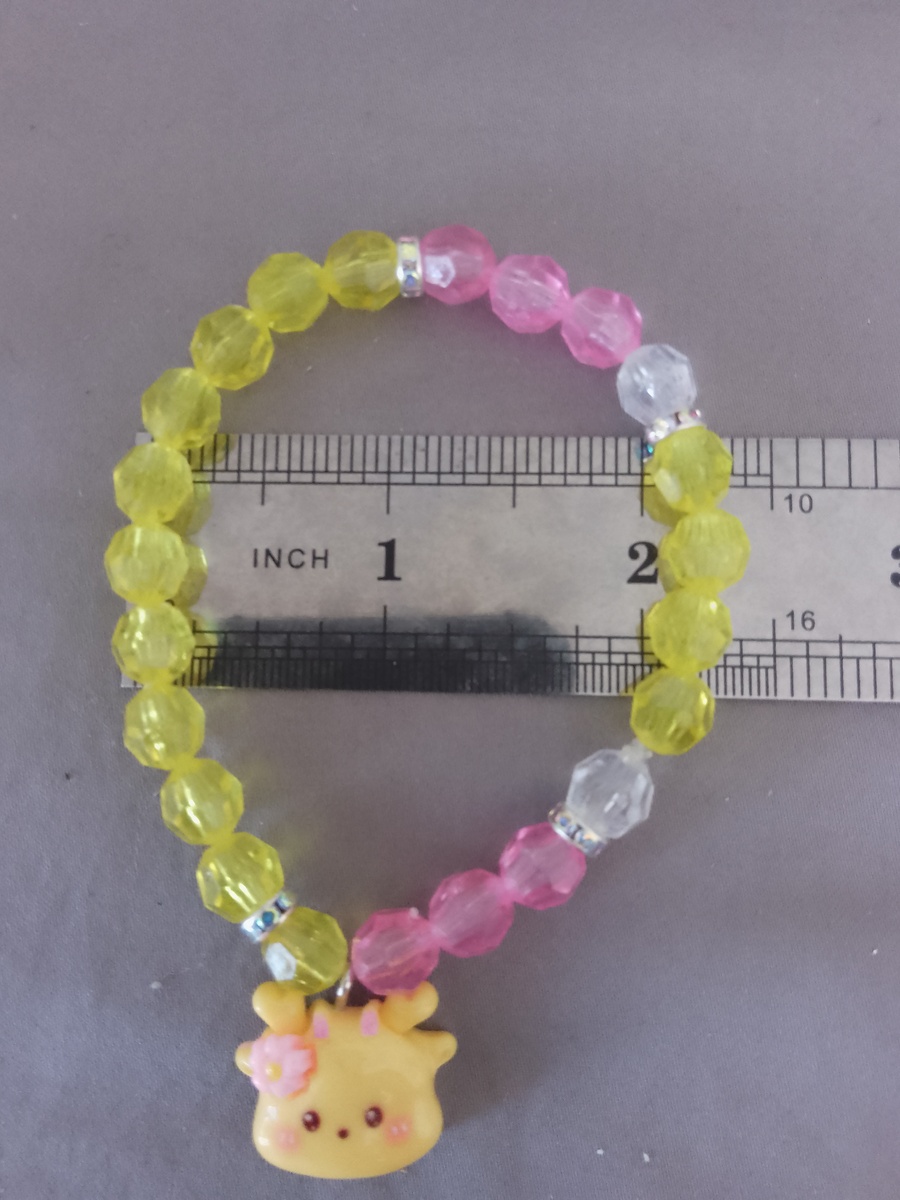 Add a touch of charm to your day with this handmade beaded bracelet featuring faceted plastic beads in cheerful yellow, soft pink, and clear tones. Silver spacer beads add sparkle, and the centerpiece is a cute yellow charm with a pink flower — perfect for fans of kawaii or pastel styles.