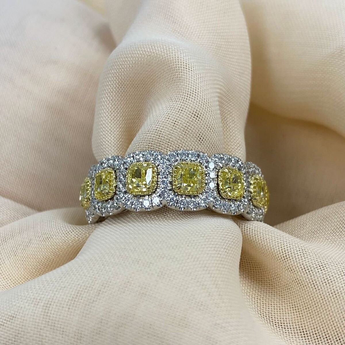 ¡Spectacular One of a Kind Wedding Band agregara magia al momento especial! Esta alianza de boda de Art Deco Design Eternity presenta 13 diamantes amarillos naturales de corte de cojín con bordes individuales en Halo de micro pavimento incoloro. Hecho a mano en oro blanco y amarillo de 14k completado con un alto esmalte. El peso total de quilates es de 4.02 quilates. ¡Este es un regalo increíble para tu encantador!