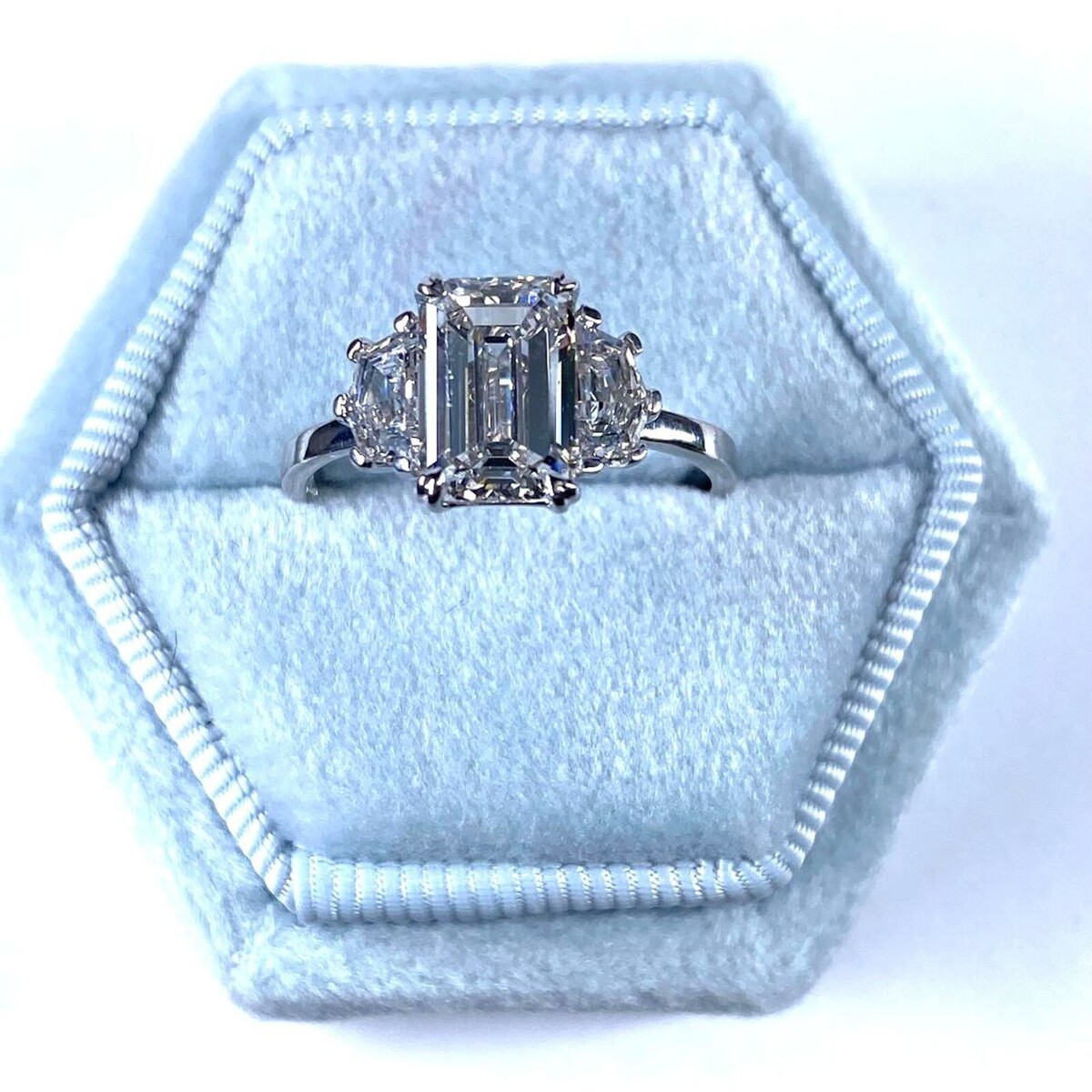 Cette elegante bague au design a trois pierres symbolise le voyage de votre relation avec une grace intemporelle ! Fabrique en or blanc 14 carats, il presente une piece maîtresse epoustouflante : un diamant de laboratoire taille emeraude certifie IGI de 1,93 carats, flanque de deux diamants de laboratoire taille Cadillac , representant le passe, le present et l'avenir de votre partenariat. Chaque diamant scintille d'un eclat unique, refletant les souvenirs partages et la promesse d'un bel avenir ensemble. Le poids total en carats est de 2,45 carats. Nos produits sont tous fabriques a la main avec de la qualite et des soins, au c?ur du district de Diamond sur la 47th Street a New York. Notre devouement et notre engagement envers le travail et la qualite fins depassent tous les autres. Etant