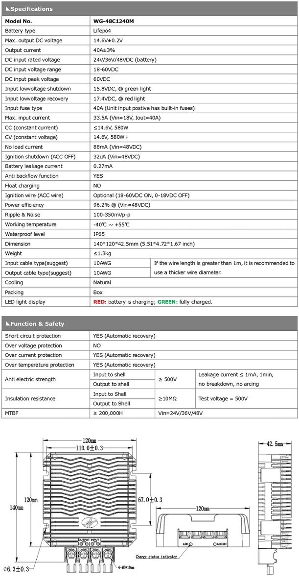 Waterproof DC 18V-60V 24V 36V 48V to 14.6V 40A Charger for 12V Lifepo4 Battery