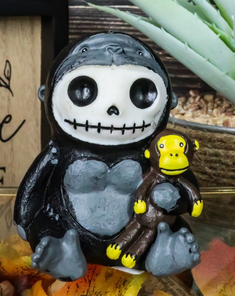 ? Furrybones Kongo is a resin figurine featuring the signature skeleton Furrybones dressed up as a gorilla holding a small monkey doll.