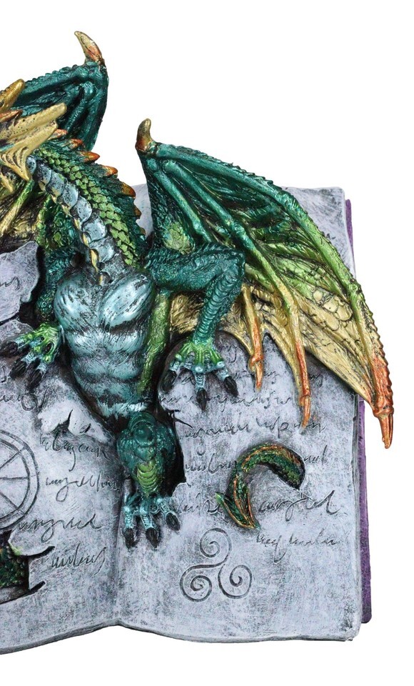 ? Dragons do not just like to fly or breathe flames. Some dragons love to read books like the dragon depicted in this sculpture. The richly metallic colored dragon emerges out of the heart of the book. Its wings colors are of iridescent finish. The book stands propped up, showing its pages to the viewer. Dark scribbles and runes represent the book's writings. This dragon of bibliography makes a great collectible, decor piece, or a gift for a fan of fantasy.