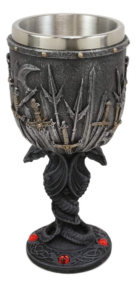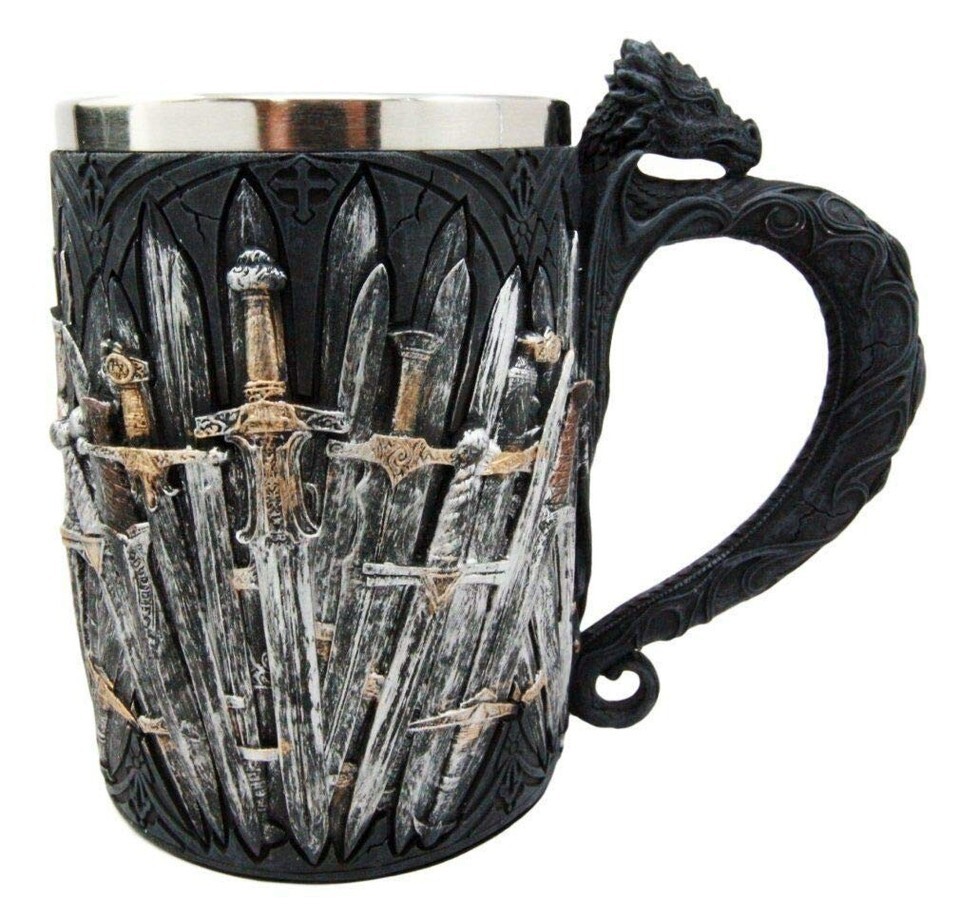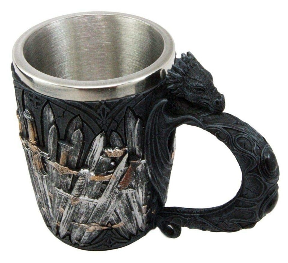 ? These Valyrian Steel Swords Armory Wine Goblet and Iron Throne Dragon coffee mug tankard are made of high quality resin with stainless steel liners, individually hand painted and polished. Color Tone May vary from pictures.