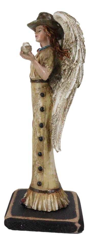 ? Our colorful Cowgirl Angel sculpture will create a beautiful focal point in any niche that you place it in. She is depicted in a cowboy hat and long western dress. Holding a dove in her hand, the angel closes her eyes as she prays to the Lord in heaven.
