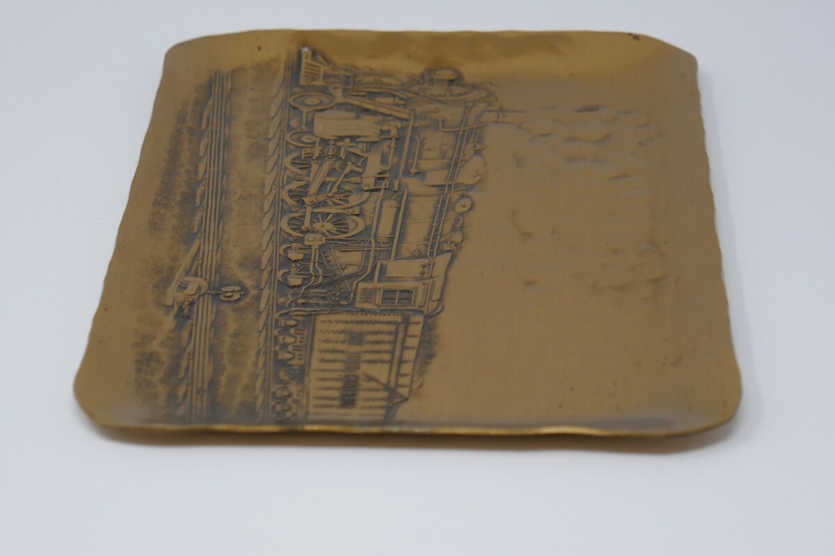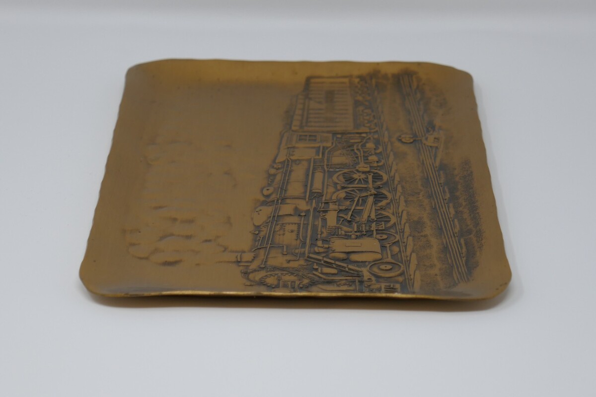 The Wendell August Solid Bronze Forge New York Central Train Plate is a unique and handmade collectible plate made of solid bronze. This measures approx. 8.75" long and 5.75" wide with minimal wear. Crafted in the United States, this plate features intricate details and a train theme, perfect for collectors or enthusiasts of American metalware. The high quality material and craftsmanship make this piece a standout addition to any collection.