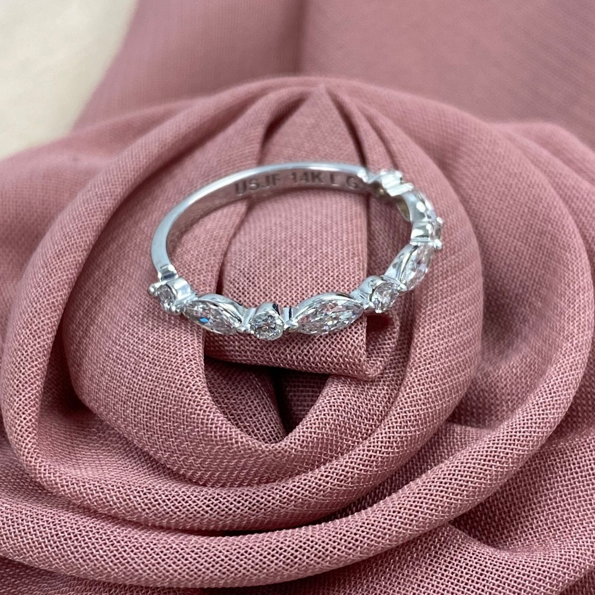 Experience timeless elegance with our wedding band, featuring a captivating design of alternating round and marquise-cut lab-grown diamonds set in luxurious 14k white gold. Each diamond shines with brilliance, adding a touch of sophistication to your special day.