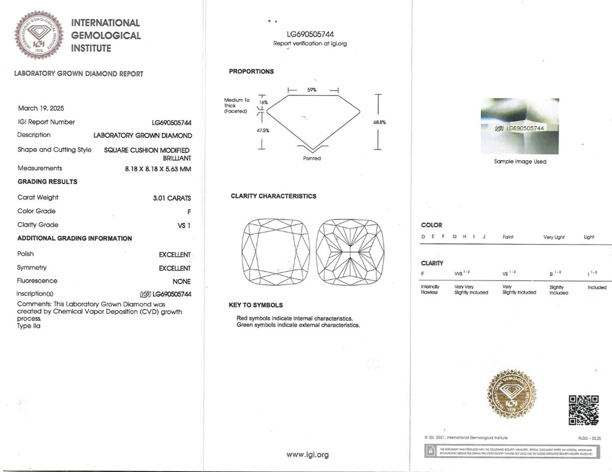 This elegant three-stone design ring symbolizes the journey of your relationship with timeless grace!!! Crafted in 14k gold, it features a stunning centerpiece: 3.01 carat IGI certified lab-grown square cushion brilliant cut lab grown diamond, flanking by two trillion brilliant cut lab grown diamonds, representing the past, the present and future of your partnership! Each diamond sparkles with its own unique brilliance, reflecting the memories shared and the promise of a beautiful future together!! The total carat weight is 3.67 carats. The ring comes with International Gemological Institute (IGI) report number LG690505744. The laboratory grown diamond's girdle is laser inscribed with the report number Our products are all hand made with quality and care, in the heart of the diamond distri