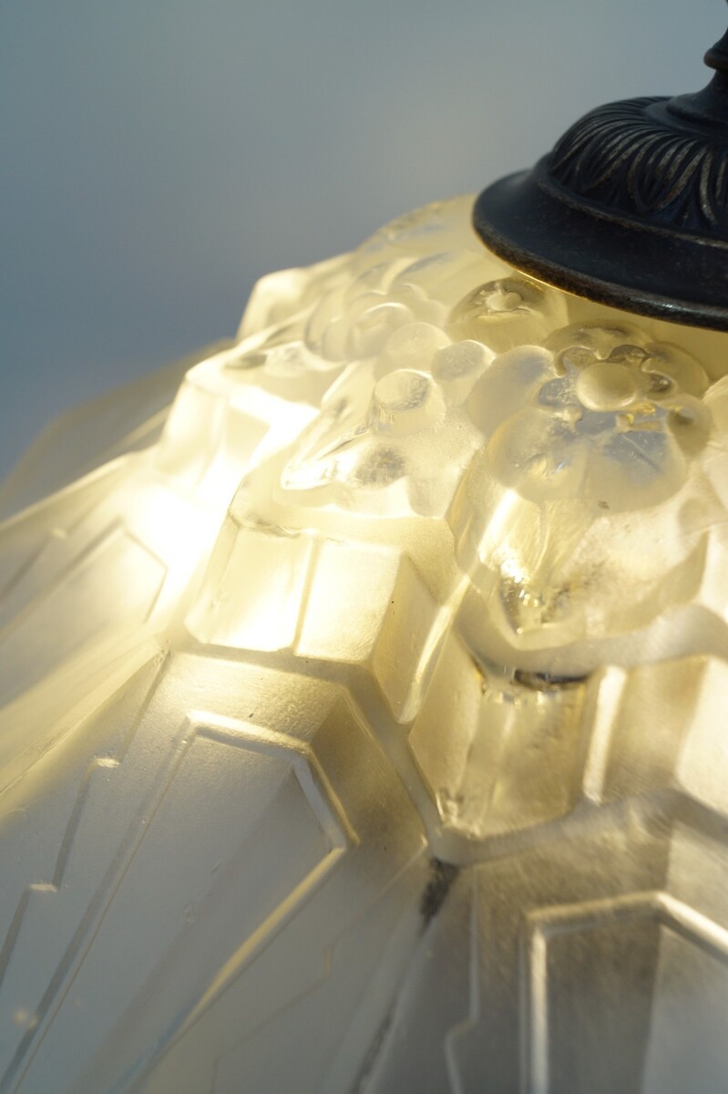 Antique French original Art Deco lamp glass, satin finish, subtle chips on the side holes (see detailed photos).