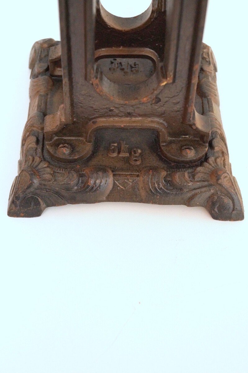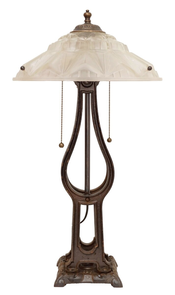 Unique Art Deco table lamp from our factory: "WEIGHBRIDGE Chrysler ". This unique designer piece was created based on an antique Art Deco scale. Iron stele with fantastic patina - completely cleaned. Antique French original Art Deco lamp glass, satin finish, subtle chips on the side holes (see detailed photos). Total height approx. 60 cm, shade diameter approx. 35 cm.Completely renewed electrical installation.Black PVC supply line with cord switch.2 x new E27 Edison brass socket with pull chain switch, up to max. 40 watts.We strongly recommend LED bulbs.Hundreds of other Art Deco lights in our shop!Small parts such as screws and washers replaced.Sold without decoration and bulbs!