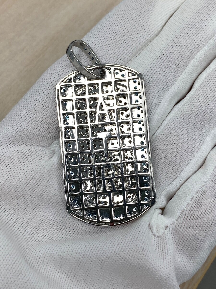 4.90CT Hombres Diamante Azul Borde Perro Placa Colgante Solido 14k Oro Blanco