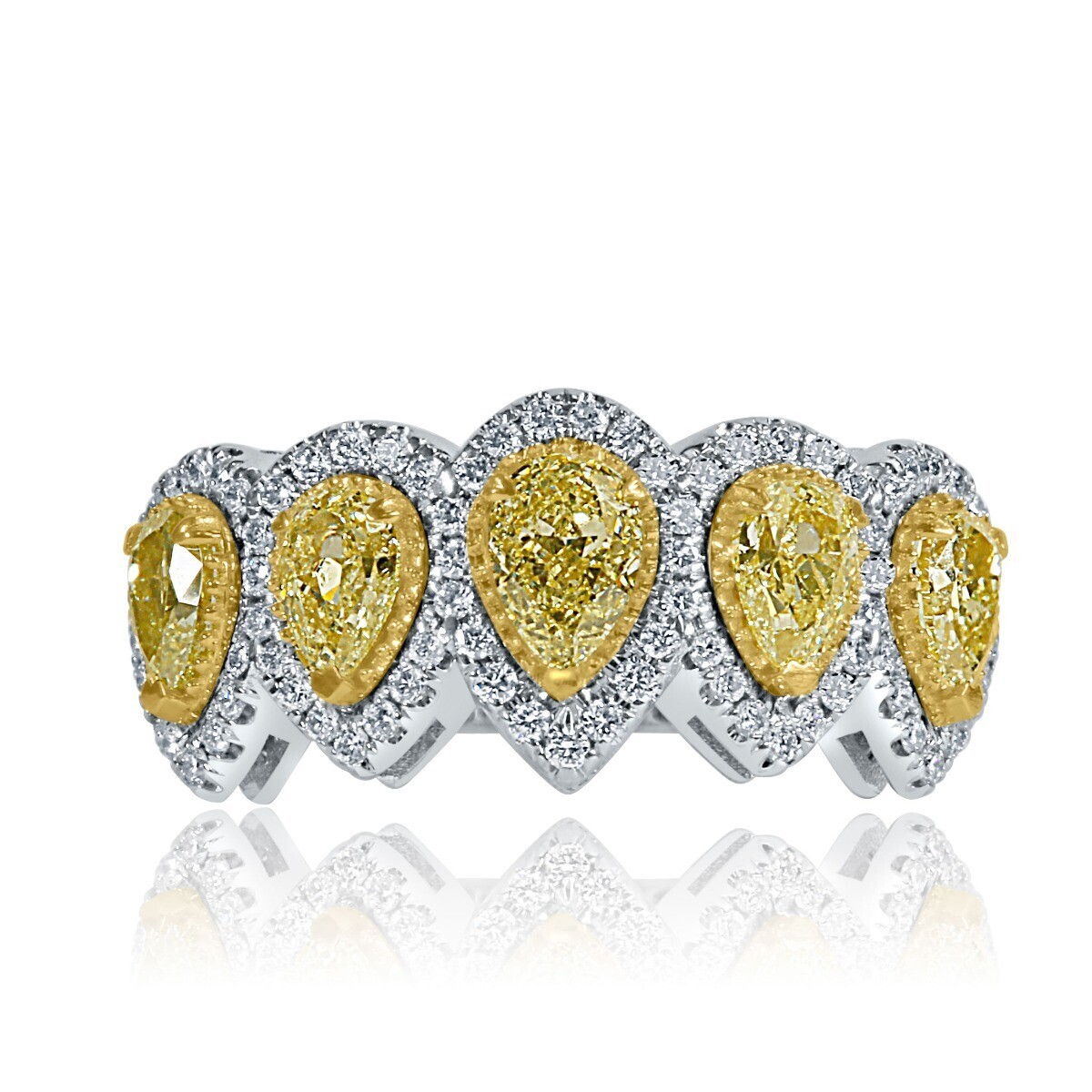 Cette alliance etincelante comporte cinq diamants naturels taille poire jaune clair fantaisie de 1,55 carats, chacun magnifiquement entoure d'un halo micro-pave de diamants ronds incolores totalisant 0,45 carat, cette bague est un veritable chef-d'?uvre.