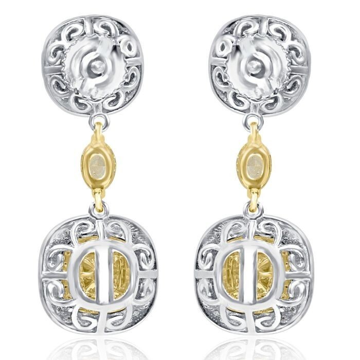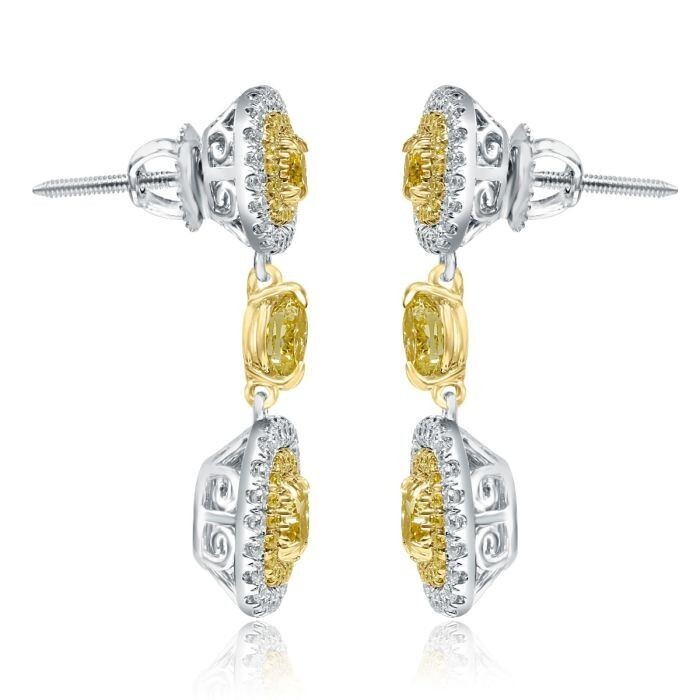 ¡Este espectacular aretes amable agregara magia al momento especial! Estos pendientes de caída colgante cuentan con piedras centrales de diamantes amarillos naturales de 1,36 ct de diamantes de diamante amarillo rodeados por un halo doble de diamantes de corte redondo incoloro y amarillo en micro pavimento con diamante amarillo fantasma natural de corte ovalado. Hecho a mano en oro de 14k dos tonos. El peso total del quilates es de 2.84 quilates. Los pendientes se aseguran con el cierre del tornillo.
