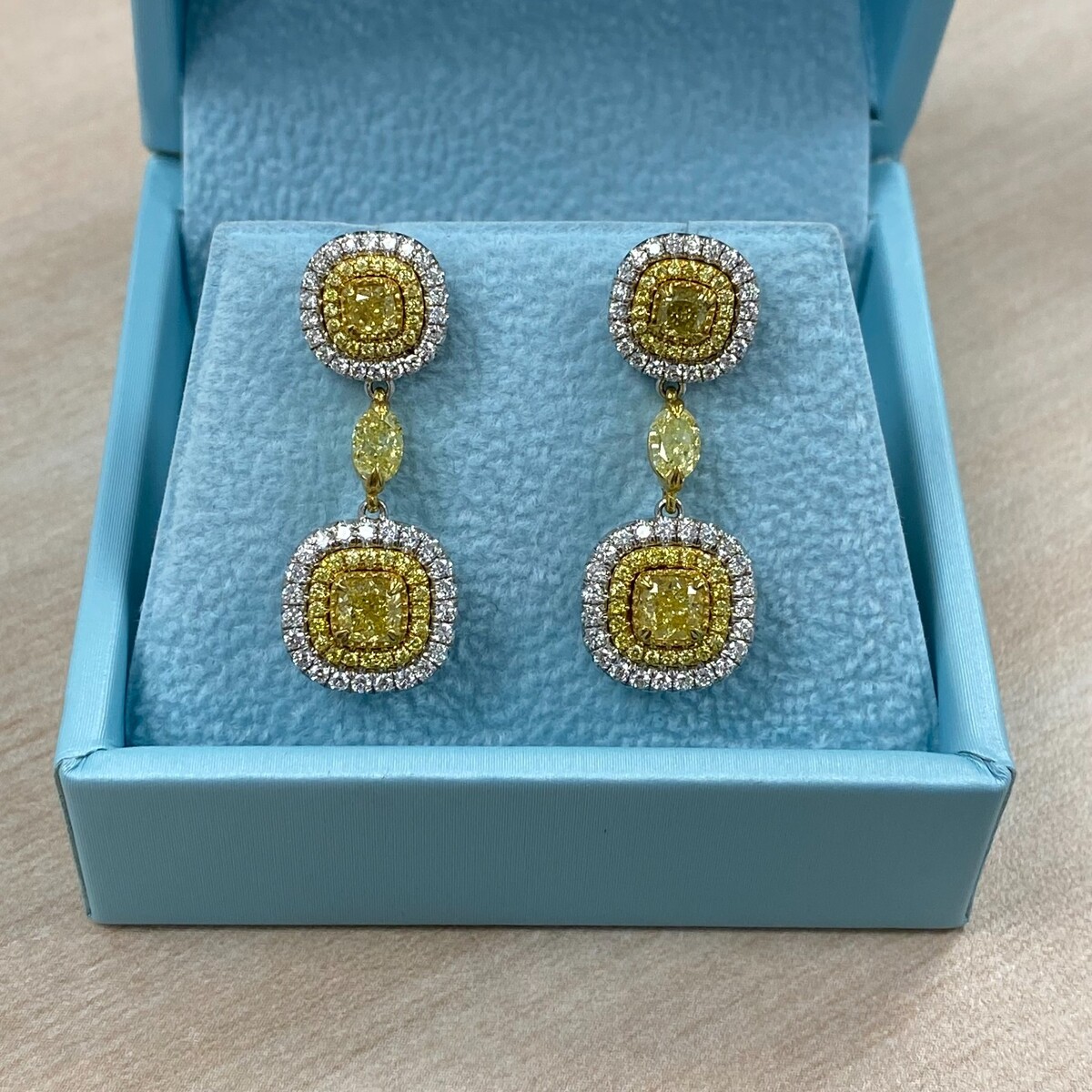 ¡Este espectacular aretes amable agregara magia al momento especial! Estos pendientes de caída colgante cuentan con piedras centrales de diamantes amarillos naturales de 1,36 ct de diamantes de diamante amarillo rodeados por un halo doble de diamantes de corte redondo incoloro y amarillo en micro pavimento con diamante amarillo fantasma natural de corte ovalado. Hecho a mano en oro de 14k dos tonos. El peso total del quilates es de 2.84 quilates. Los pendientes se aseguran con el cierre del tornillo. Todos nuestros productos estan hechos a mano con calidad y cuidado, en el corazon del Distrito de Diamantes en la calle 47 en la ciudad de Nueva York. Nuestra dedicacion y compromiso con el buen trabajo y la calidad excede a todos los demas. Dado que todos nuestros productos estan hechos a man