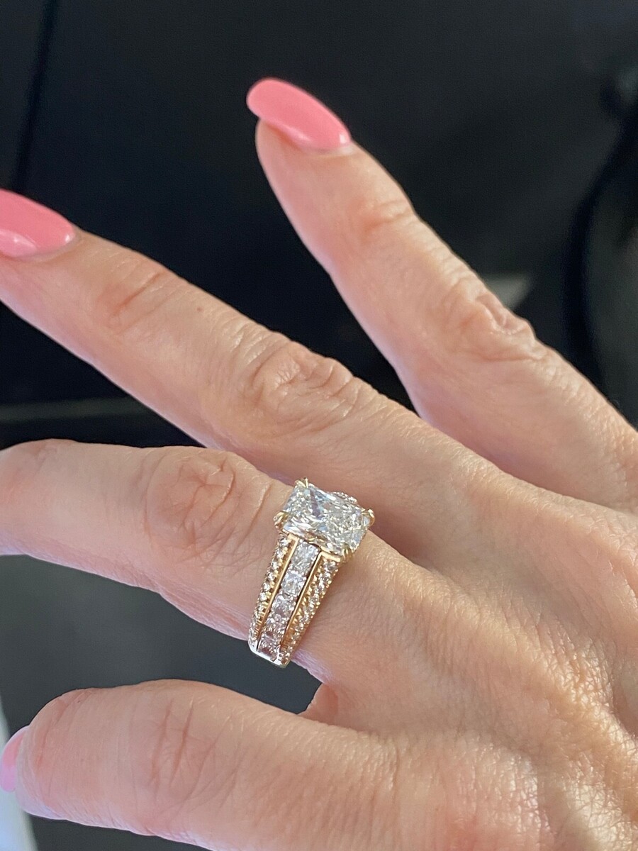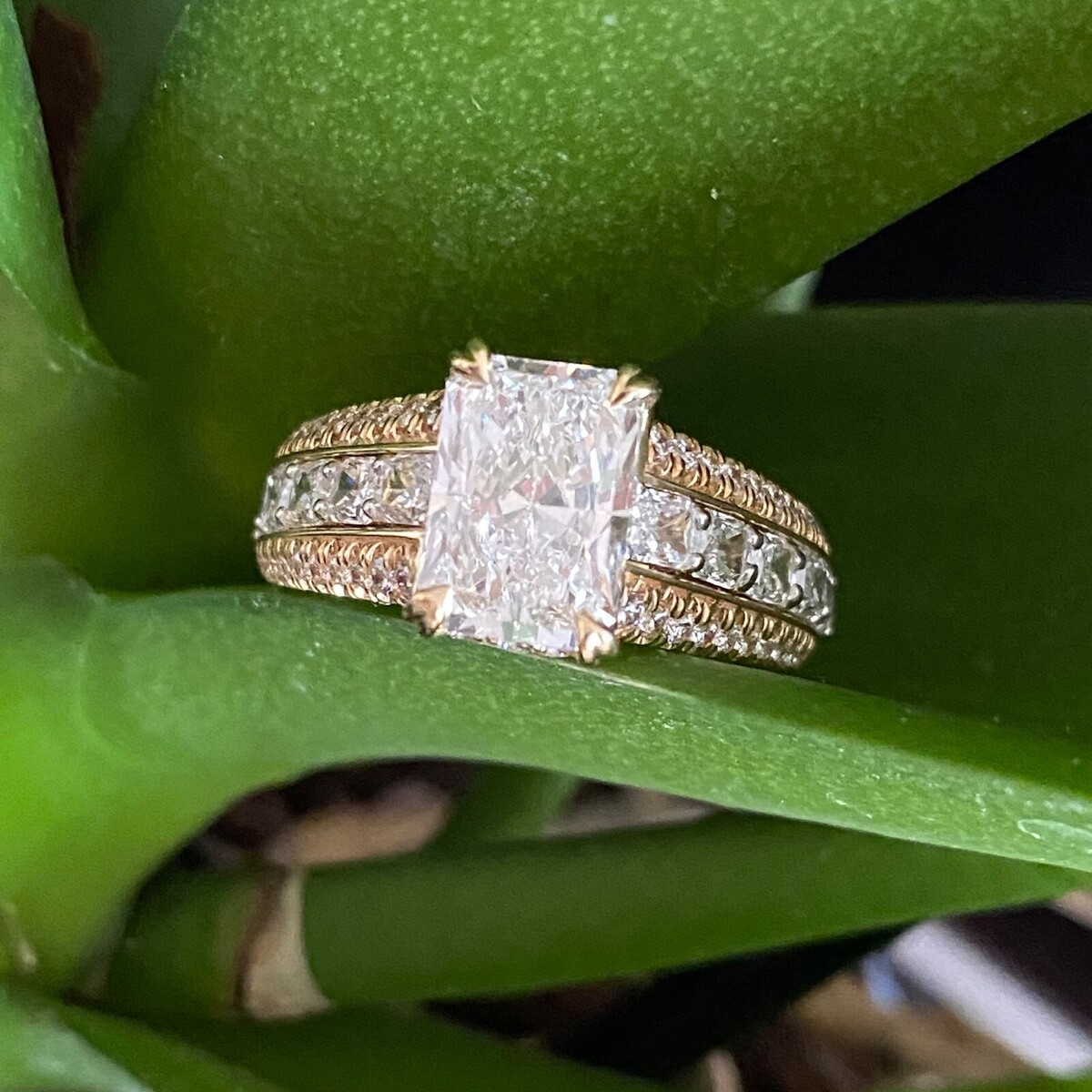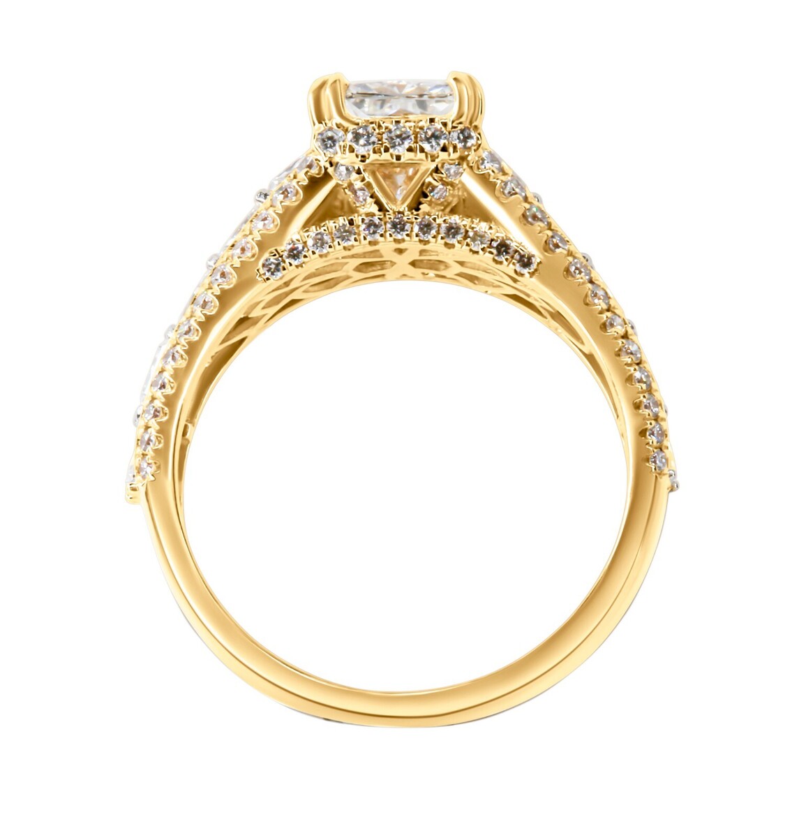 Este exquisito anillo de compromiso de diamantes irradia brillo y sofisticacion. En su corazon, un impresionante diamante cultivado en laboratorio de talla brillante radiante de 2,02 quilates con certificacion IGI se complementa con un halo oculto y una galería de diamantes redondos que realzan su deslumbrante encanto. La banda ancha de tres filas del anillo tiene un diseño intrincado y presenta una fila central de diamantes de talla radiante flanqueados por diamantes de talla redonda para mayor sparkle . Elaborada en lujoso oro amarillo de 14k y con un peso total de 3,65 quilates, esta extraordinaria pieza es el símbolo perfecto del amor y la sofisticacion eternos. Todos nuestros productos estan hechos a mano con calidad y cuidado, en el corazon del distrito de los diamantes en la calle 4