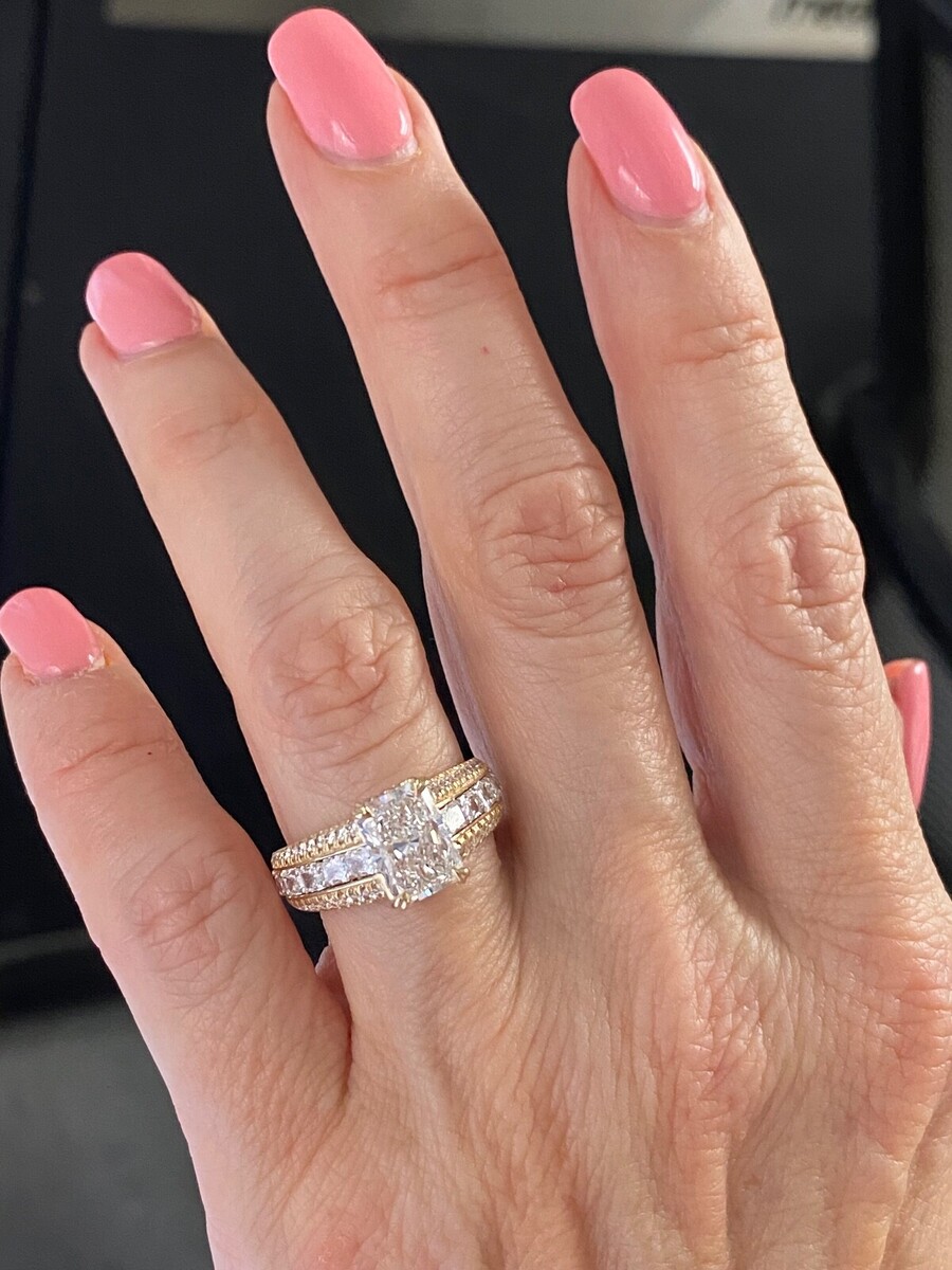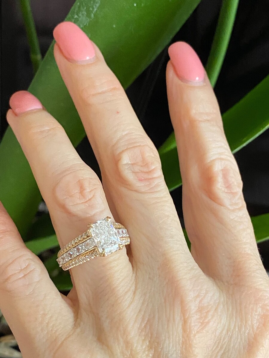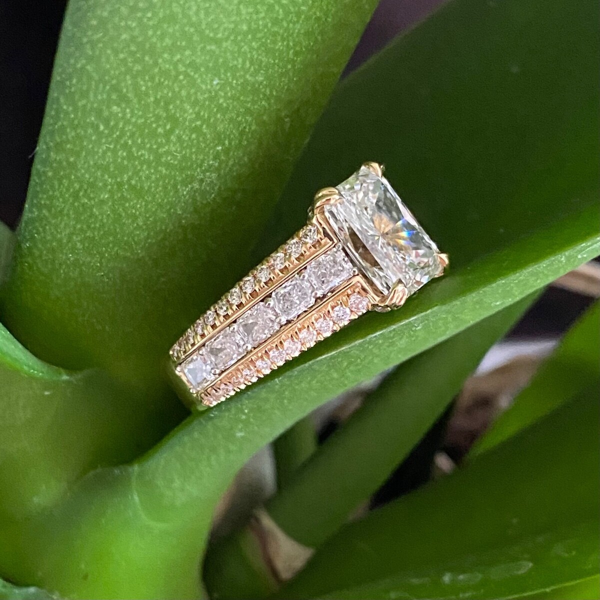 Este exquisito anillo de compromiso de diamantes irradia brillo y sofisticacion. En su corazon, un impresionante diamante cultivado en laboratorio de talla brillante radiante de 2,02 quilates con certificacion IGI se complementa con un halo oculto y una galería de diamantes redondos que realzan su deslumbrante encanto. La banda ancha de tres filas del anillo tiene un diseño intrincado y presenta una fila central de diamantes de talla radiante flanqueados por diamantes de talla redonda para mayor sparkle . Elaborada en lujoso oro amarillo de 14k y con un peso total de 3,65 quilates, esta extraordinaria pieza es el símbolo perfecto del amor y la sofisticacion eternos. Todos nuestros productos estan hechos a mano con calidad y cuidado, en el corazon del distrito de los diamantes en la calle 4