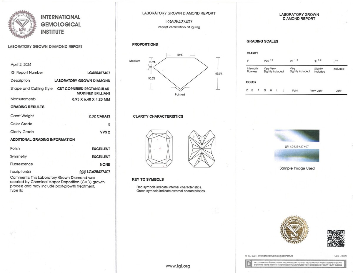 Igi 2.03CT Laboratorio Crecido Radiante Diamante Compromiso Anillo 18k Oro